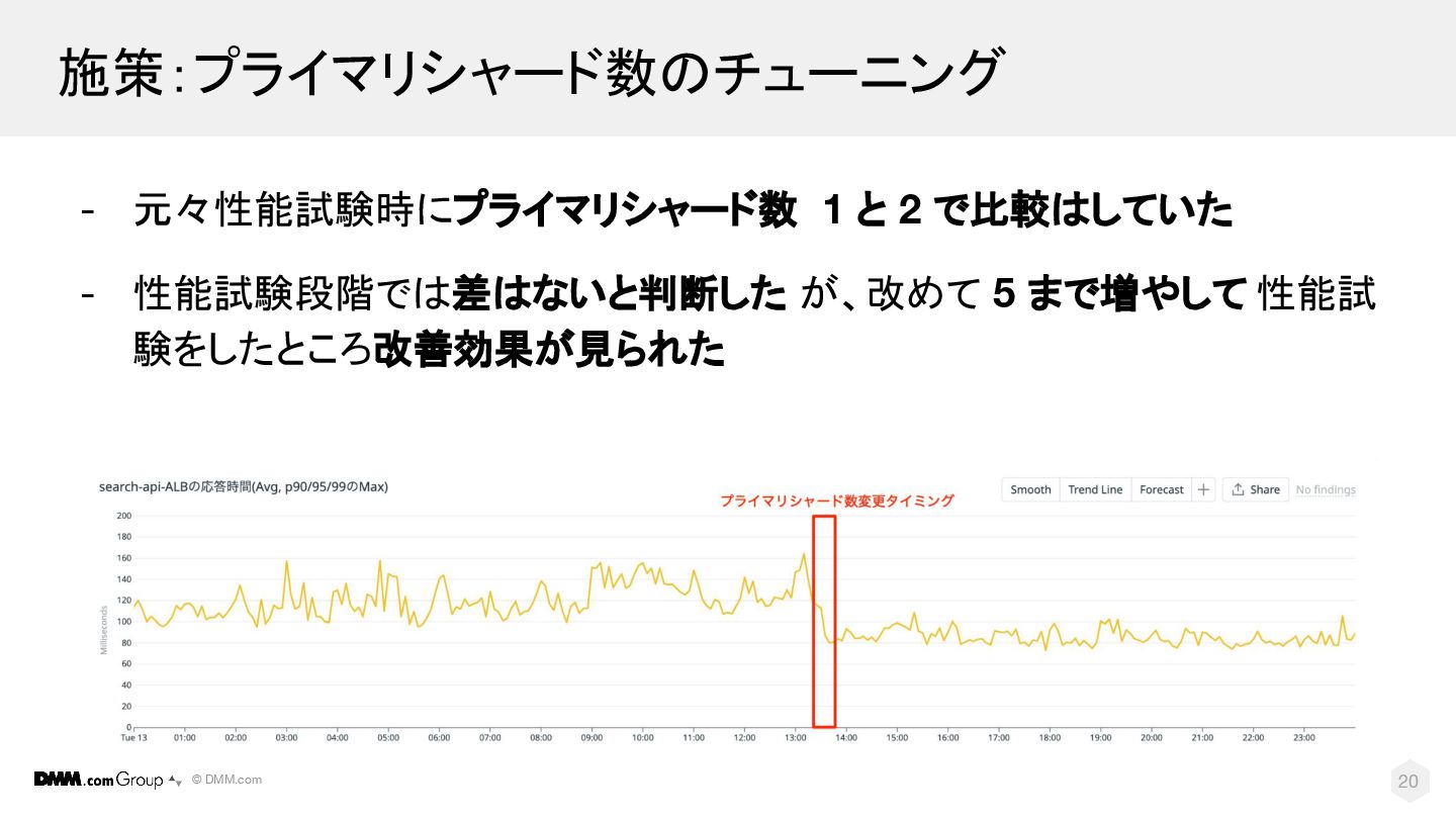 © DMM.com 20 施策:プライマリシャード数のチューニング - 元々性能試験時にプライマリシャード数 1 と 2 で比較はしていた