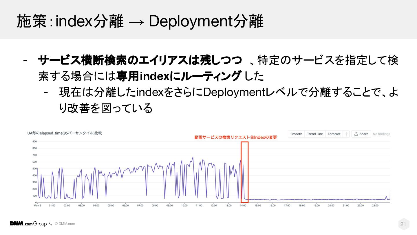 © DMM.com 21 施策:index分離 → Deployment分離 - サービス横断検索のエイリアスは残しつつ 、特定のサービスを指定して検 索する場合には専用indexにルーティング