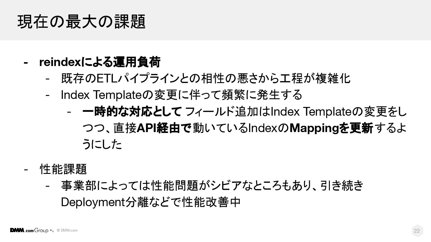 Templateの変更に伴って頻繁に発生する - 一時的な対応として フィールド追加はIndex Templateの変更をし つつ、直接API経由で動いているIndexのMappingを更新するよ うにした - 性能課題 - 事業部によっては性能問題がシビアなところもあり、引き続き Deployment分離などで性能改善中