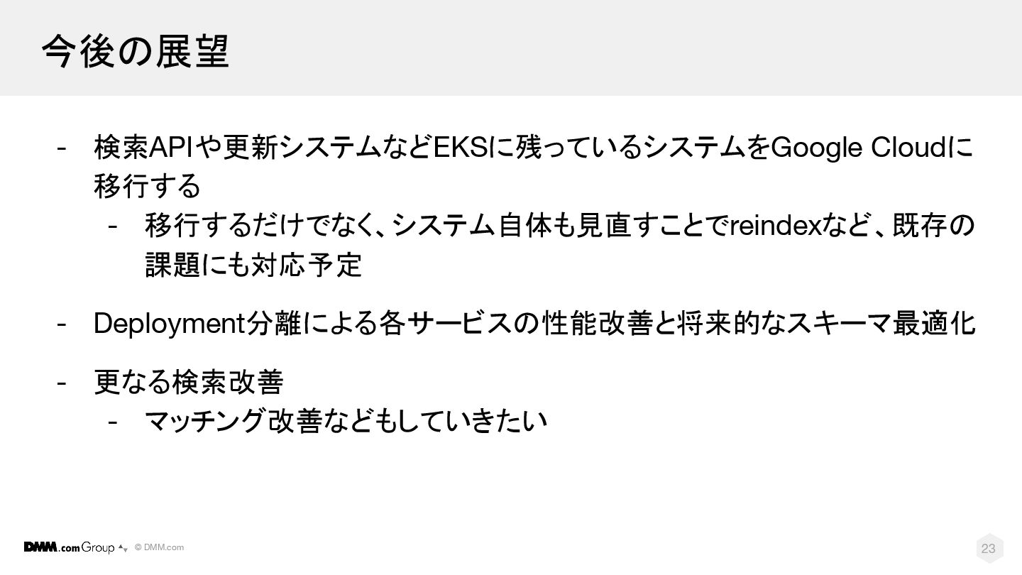 © DMM.com 23 今後の展望 - 検索APIや更新システムなどEKSに残っているシステムをGoogle Cloudに 移行する - 移行するだけでなく、システム自体も見直すことでreindexなど、既存の
