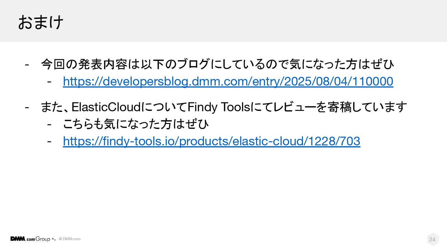 © DMM.com 24 おまけ - 今回の発表内容は以下のブログにしているので気になった方はぜひ - https://developersblog.dmm.com/entry/2025/08/04/110000 - また、ElasticCloudについてFindy