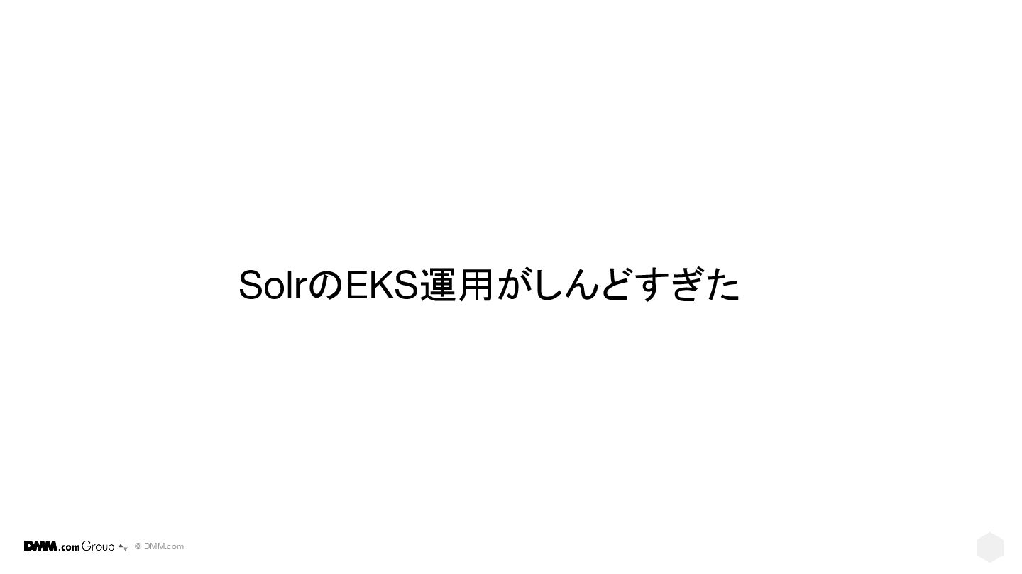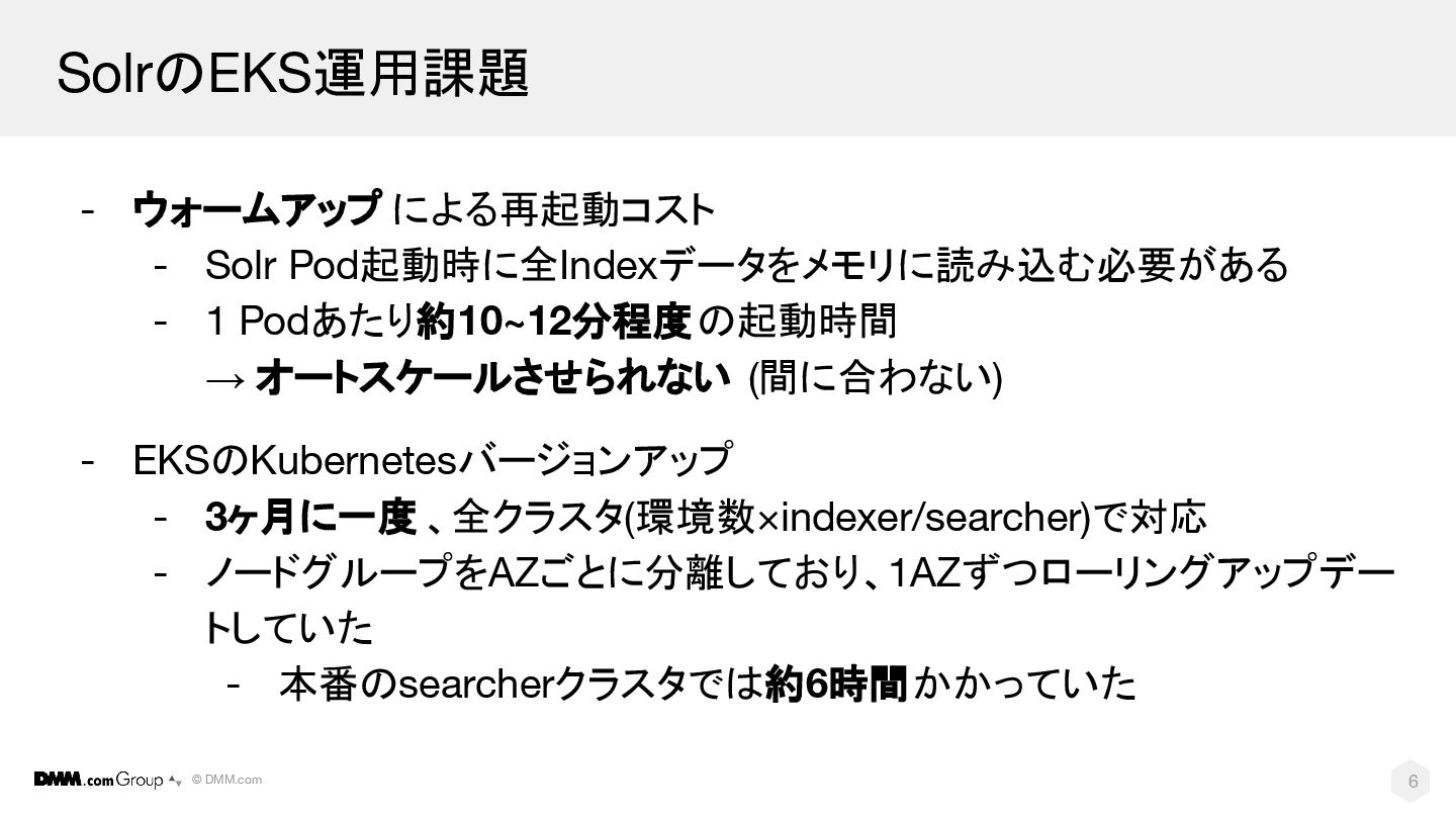 © DMM.com 6 SolrのEKS運用課題 - ウォームアップ による再起動コスト - Solr Pod起動時に全Indexデータをメモリに読み込む必要がある