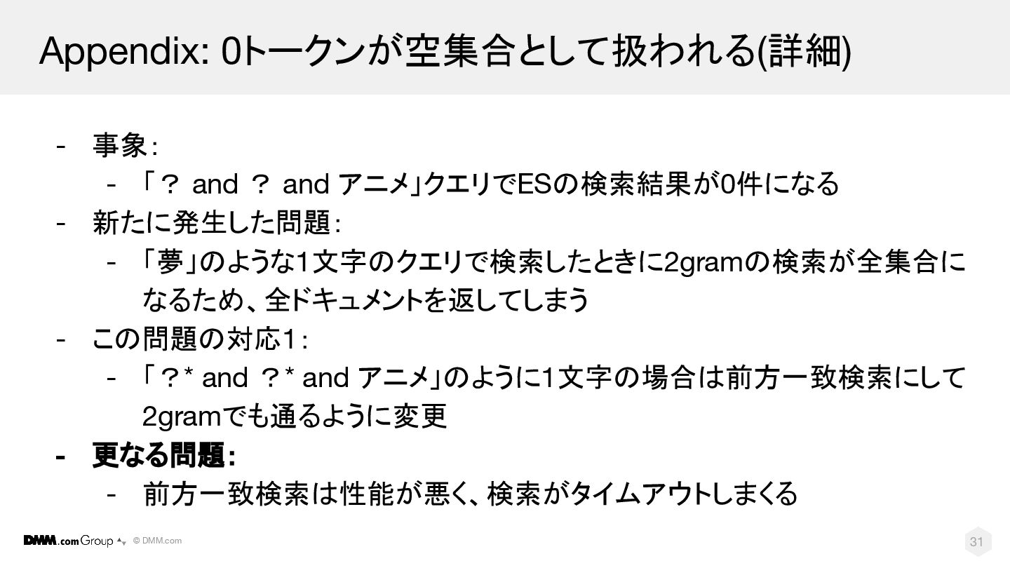 ? and アニメ」クエリでESの検索結果が0件になる - 新たに発生した問題: - 「夢」のような1文字のクエリで検索したときに2gramの検索が全集合に なるため、全ドキュメントを返してしまう - この問題の対応1: - 「?* and ?* and アニメ」のように1文字の場合は前方一致検索にして 2gramでも通るように変更 - 更なる問題: - 前方一致検索は性能が悪く、検索がタイムアウトしまくる
