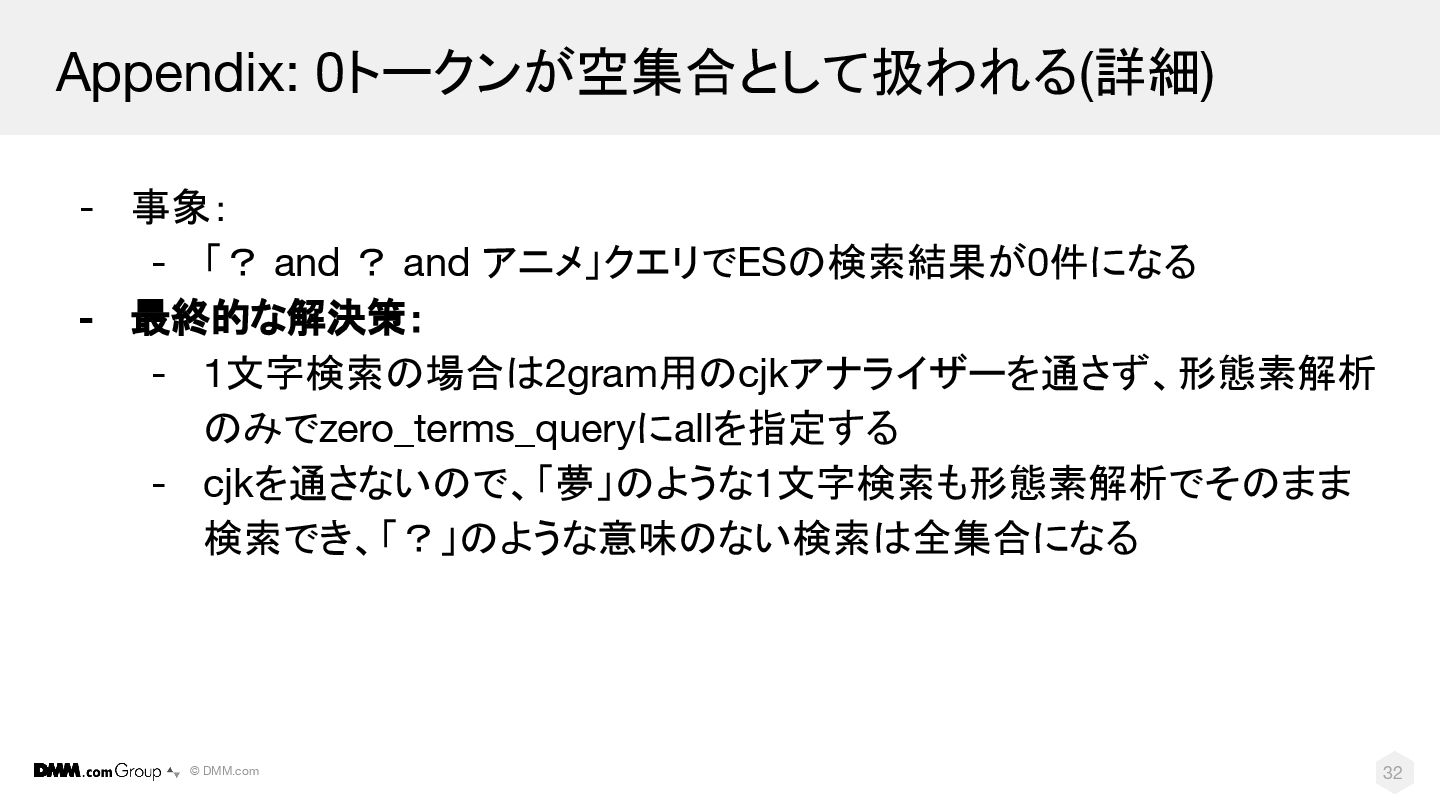 ? and アニメ」クエリでESの検索結果が0件になる - 最終的な解決策: - 1文字検索の場合は2gram用のcjkアナライザーを通さず、形態素解析 のみでzero_terms_queryにallを指定する - cjkを通さないので、「夢」のような1文字検索も形態素解析でそのまま 検索でき、「?」のような意味のない検索は全集合になる
