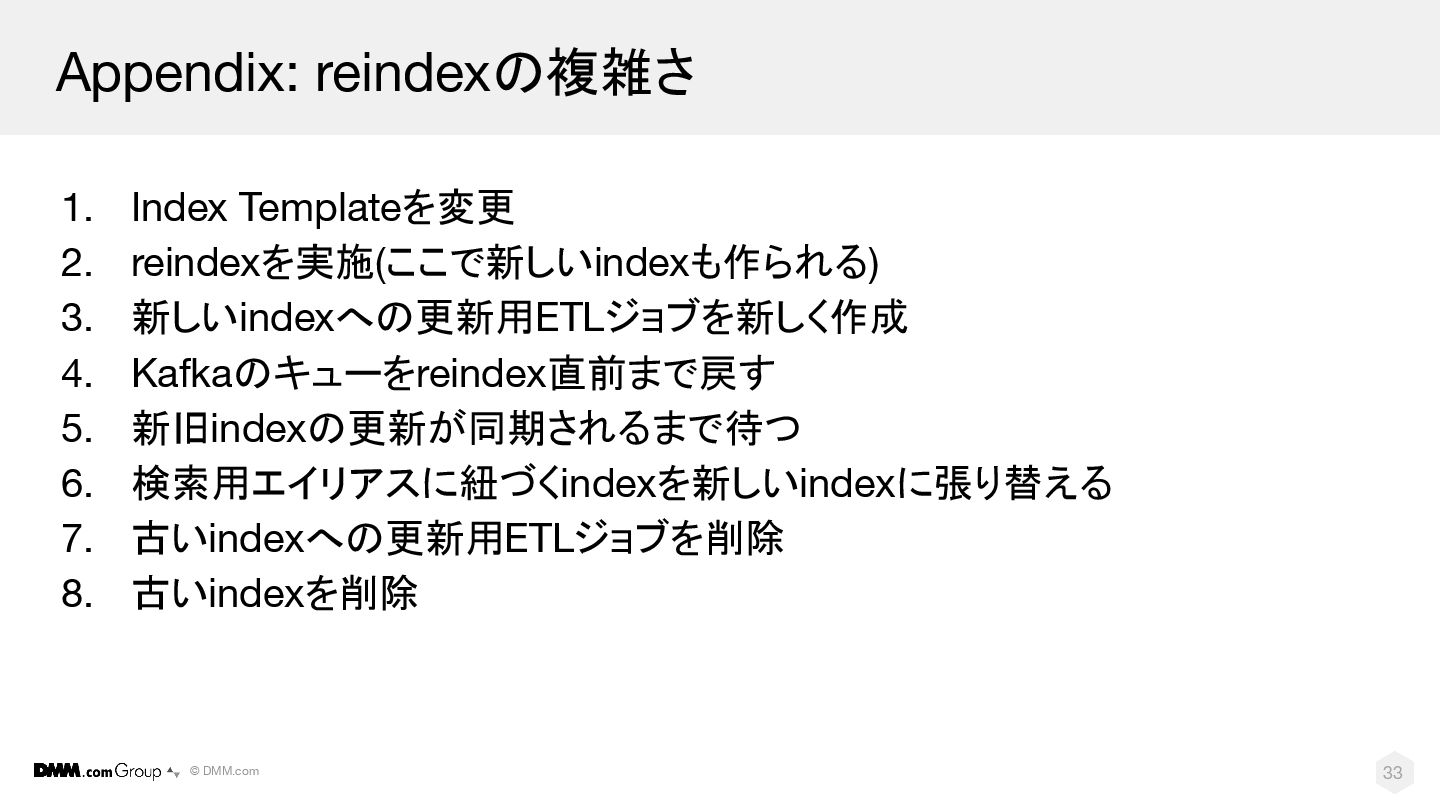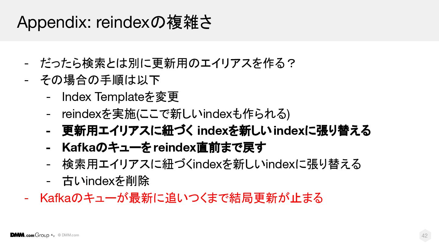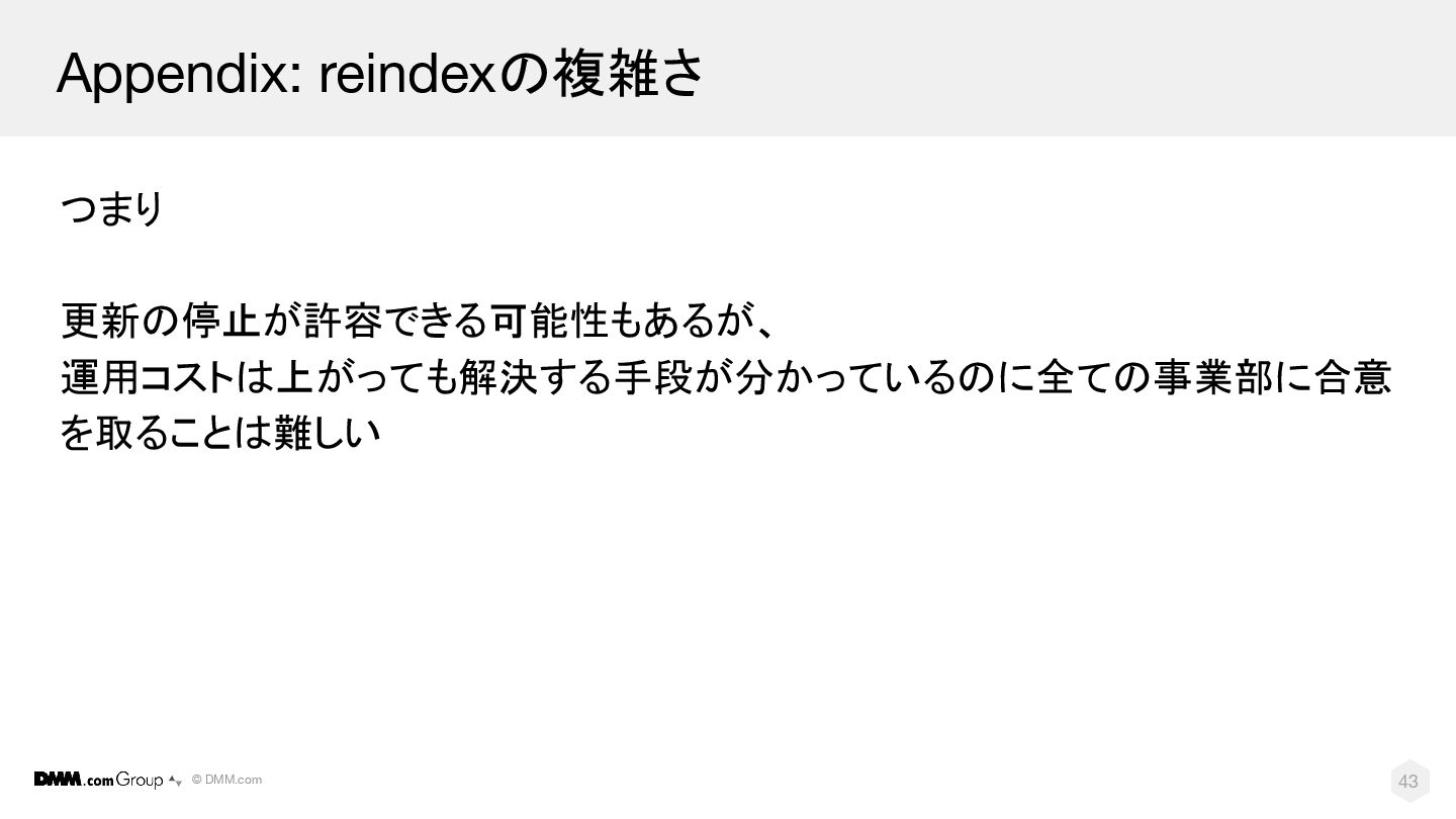 © DMM.com 43 Appendix: reindexの複雑さ つまり 更新の停止が許容できる可能性もあるが、 運用コストは上がっても解決する手段が分かっているのに全ての事業部に合意 を取ることは難しい
