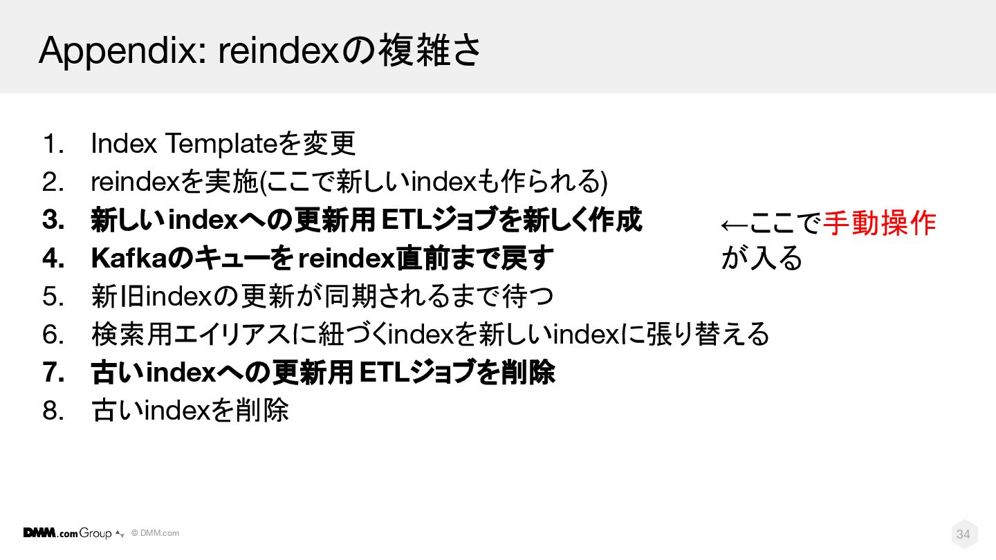 © DMM.com 33 Appendix: reindexの複雑さ 1. Index Templateを変更 2. reindexを実施(ここで新しいindexも作られる)