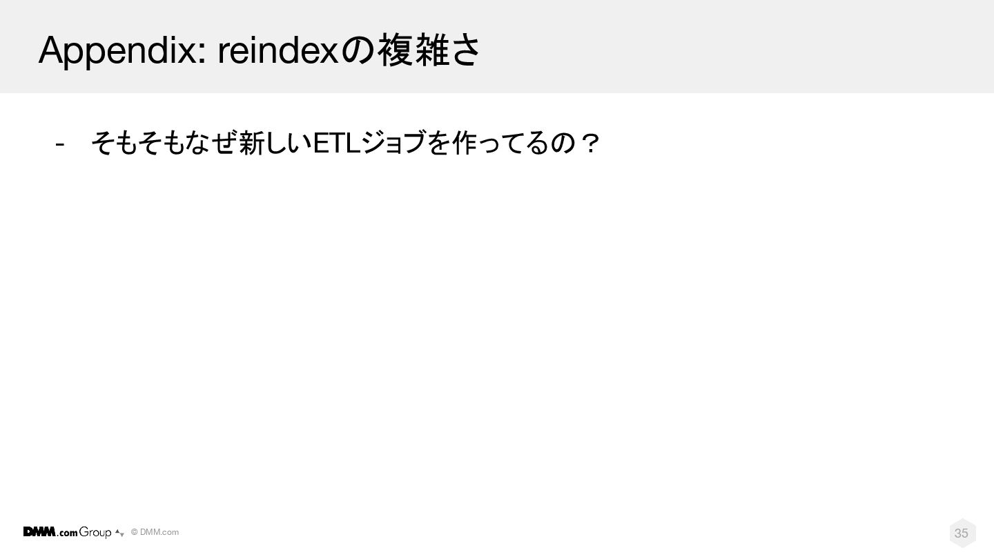 © DMM.com 35 Appendix: reindexの複雑さ - そもそもなぜ新しいETLジョブを作ってるの?