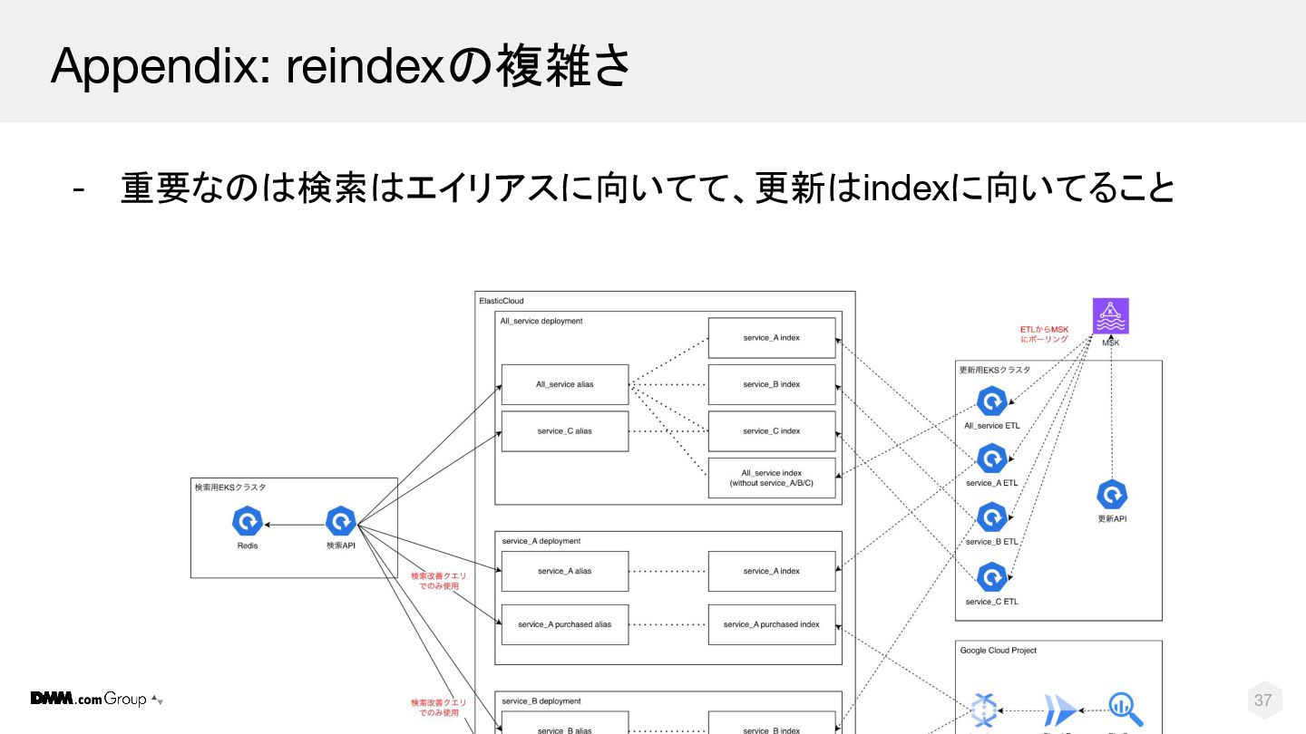 © DMM.com 36 Appendix: reindexの複雑さ - そもそもなぜ新しいETLジョブを作ってるの? - 現在の検索システムのざっくりした構成が以下