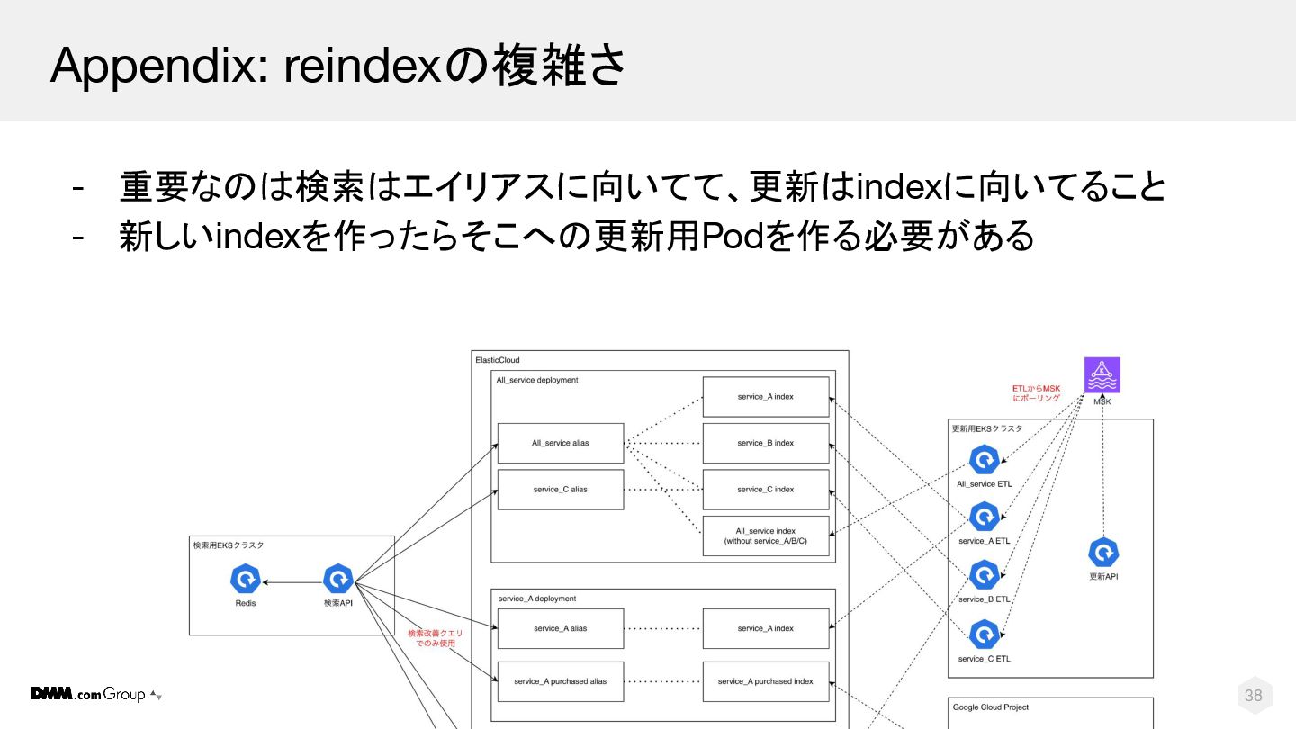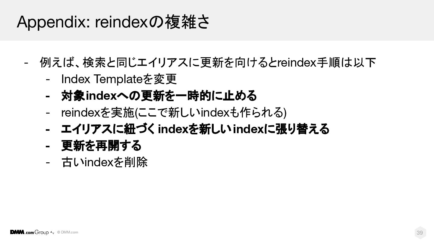 © DMM.com 38 Appendix: reindexの複雑さ - 重要なのは検索はエイリアスに向いてて、更新はindexに向いてること - 新しいindexを作ったらそこへの更新用Podを作る必要がある