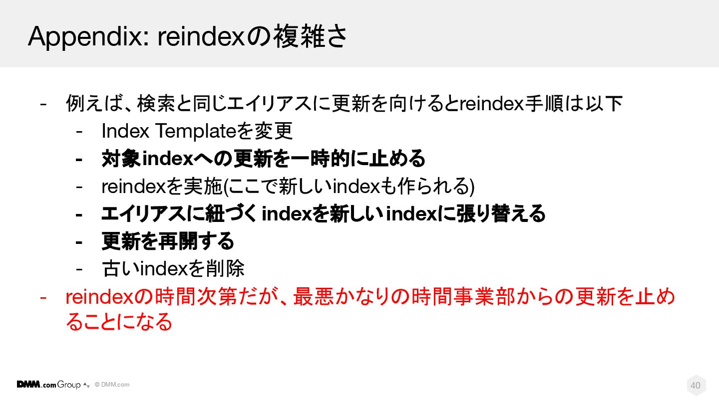 © DMM.com 39 Appendix: reindexの複雑さ - 例えば、検索と同じエイリアスに更新を向けるとreindex手順は以下 - Index Templateを変更