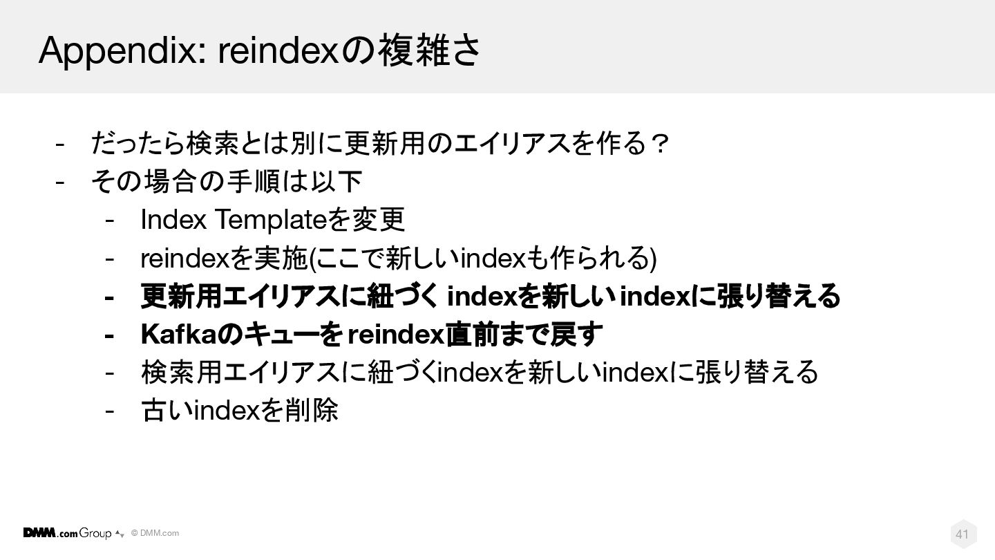 © DMM.com 40 Appendix: reindexの複雑さ - 例えば、検索と同じエイリアスに更新を向けるとreindex手順は以下 - Index Templateを変更