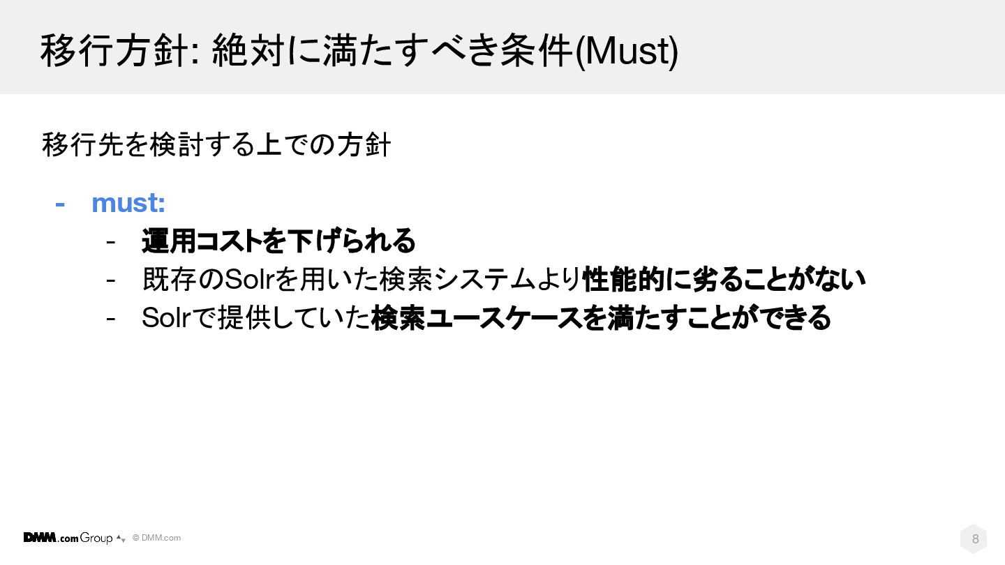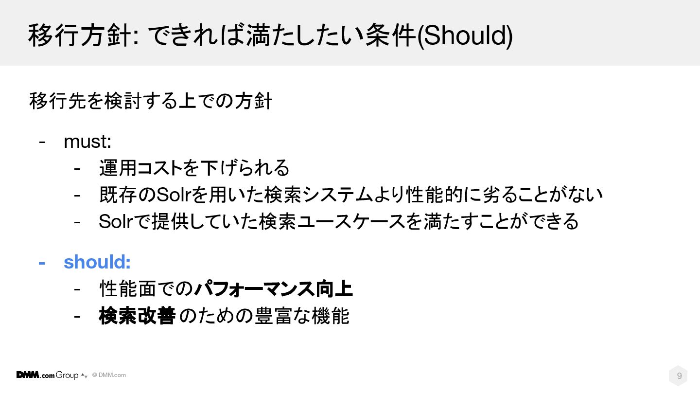 © DMM.com 8 移行方針: 絶対に満たすべき条件(Must) 移行先を検討する上での方針 - must: - 運用コストを下げられる