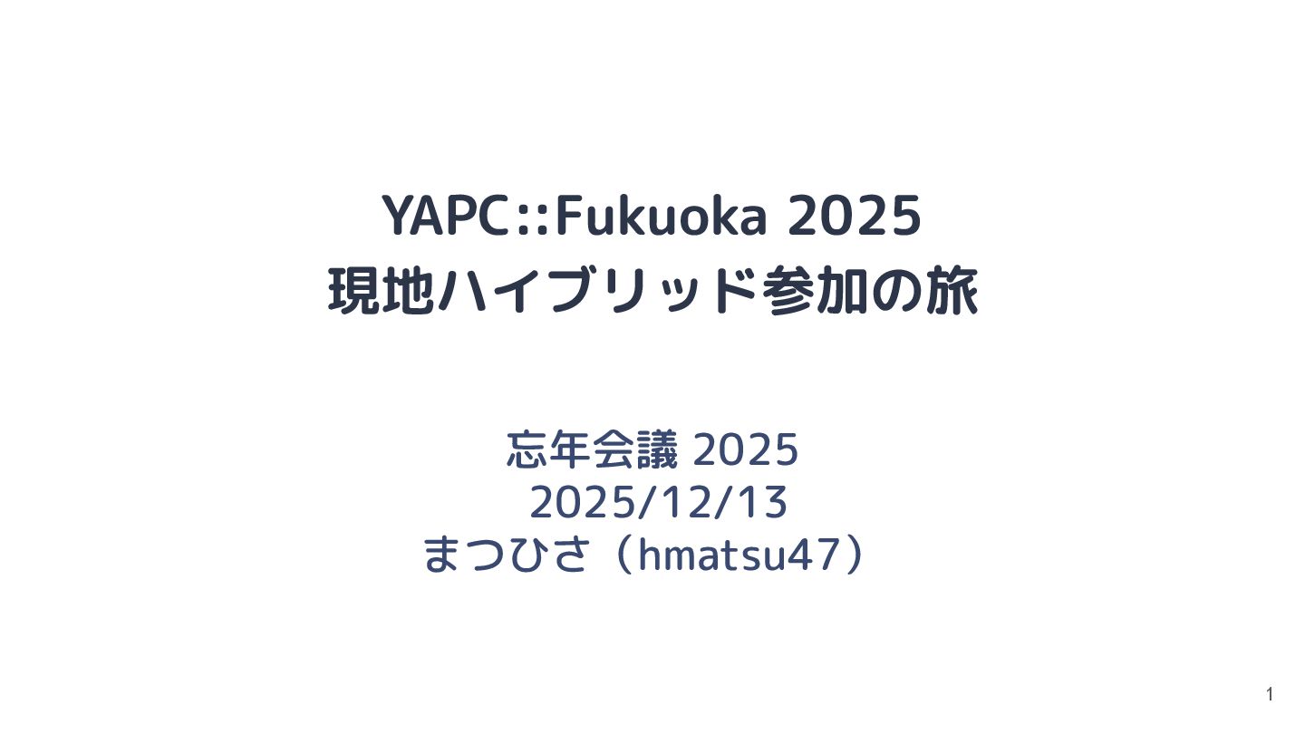 YAPC::Fukuoka 2025 現地ハイブリッド参加の旅 忘年会議 2025 2025/12/13 まつひさ(hmatsu47) 1