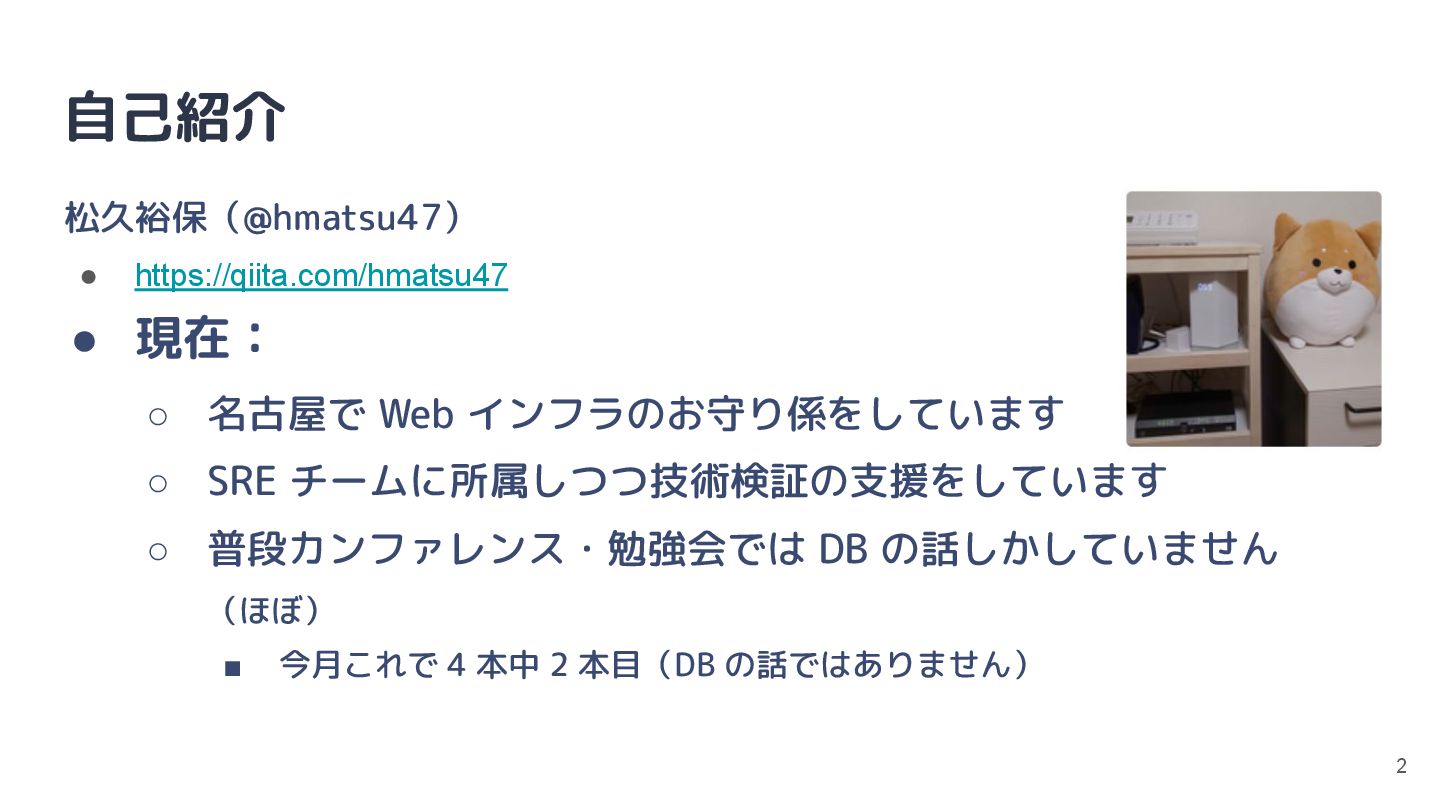 ◦ SRE チームに所属しつつ技術検証の支援をしています ◦ 普段カンファレンス・勉強会では DB の話しかしていません (ほぼ) ▪ 今月これで 4 本中 2 本目(DB の話ではありません) 2