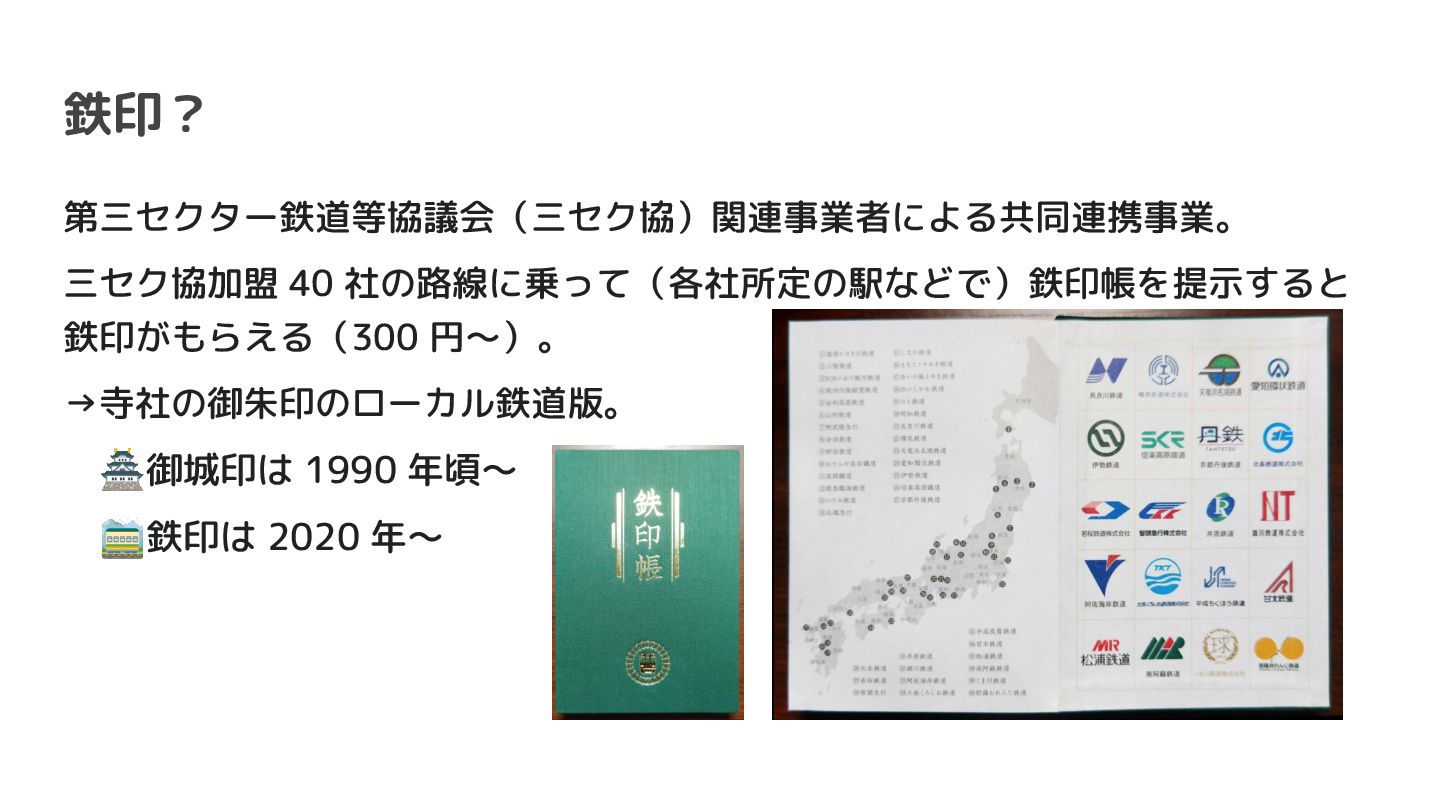 鉄印? 第三セクター鉄道等協議会(三セク協)関連事業者による共同連携事業。 三セク協加盟 40 社の路線に乗って(各社所定の駅などで)鉄印帳を提示すると 鉄印がもらえる(300 円~)。 →寺社の御朱印のローカル鉄道版。 🏯御城印は 1990