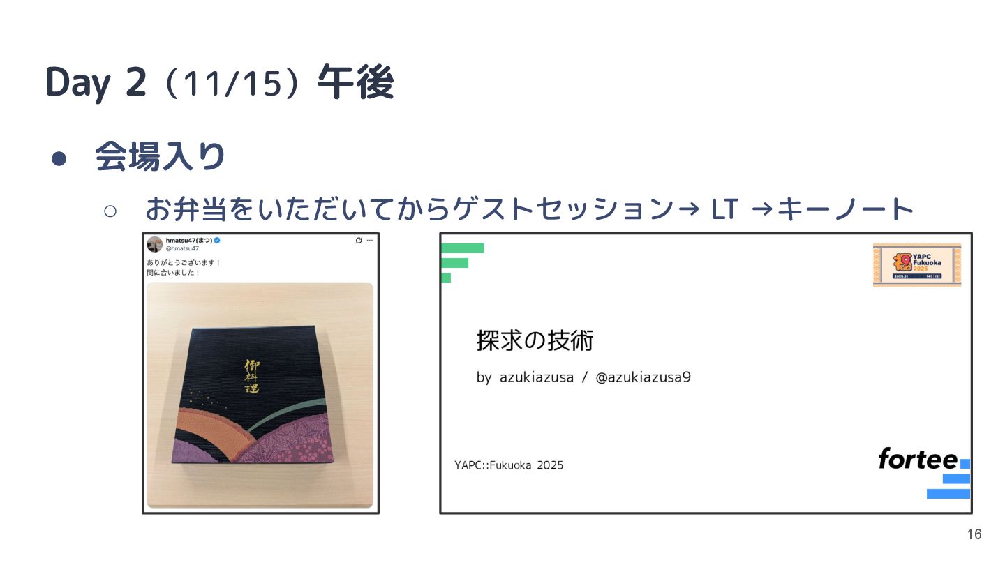 Day 2(11/15)午後 • 会場入り ◦ お弁当をいただいてからゲストセッション→ LT →キーノート 16