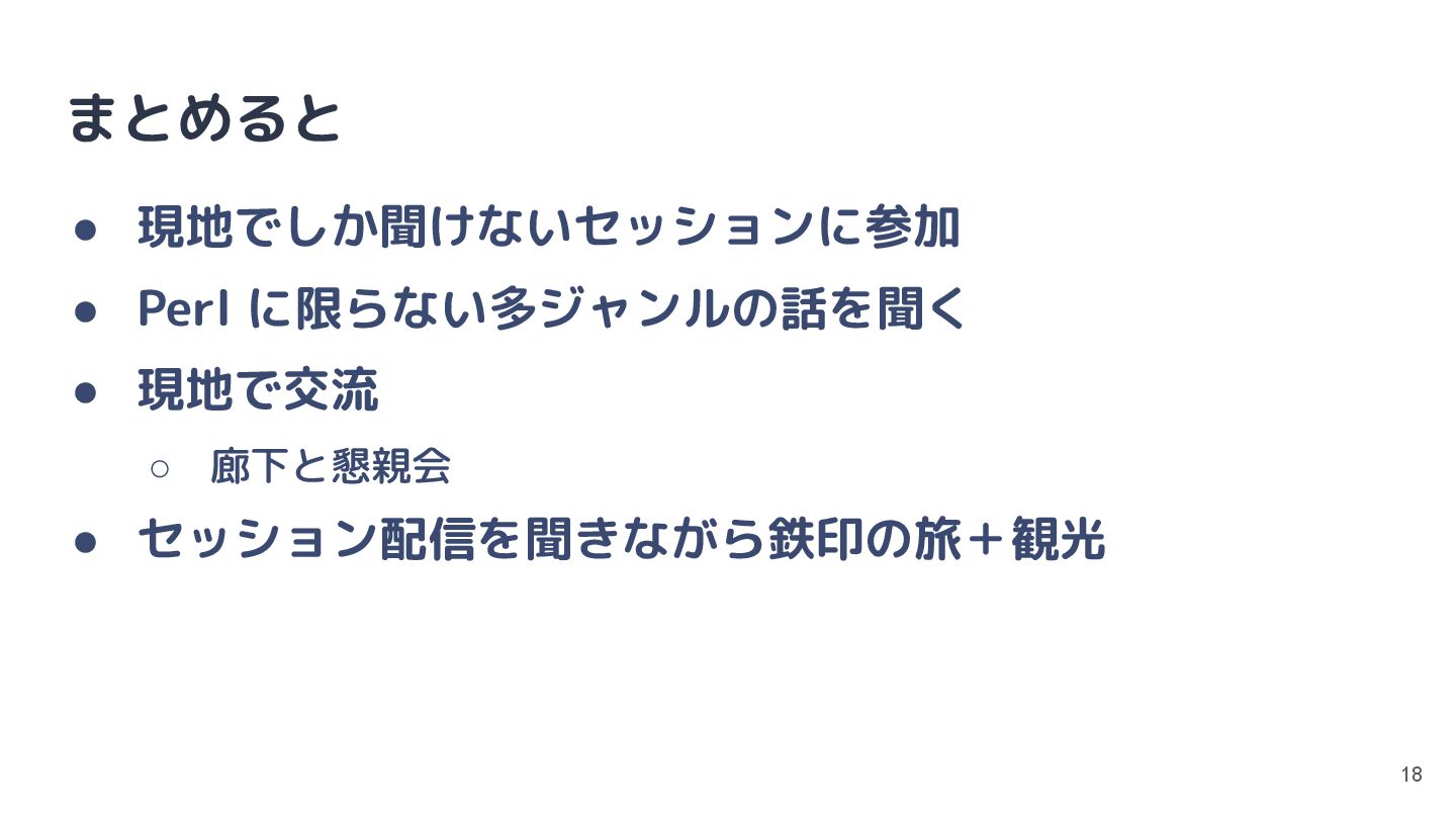 まとめると • 現地でしか聞けないセッションに参加 • Perl に限らない多ジャンルの話を聞く • 現地で交流 ◦ 廊下と懇親会