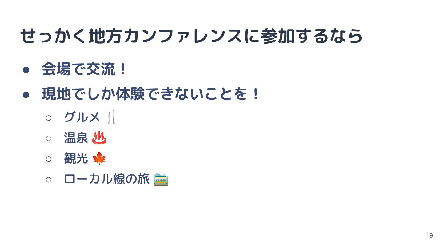 せっかく地方カンファレンスに参加するなら • 会場で交流! • 現地でしか体験できないことを! ◦ グルメ 🍴 ◦ 温泉