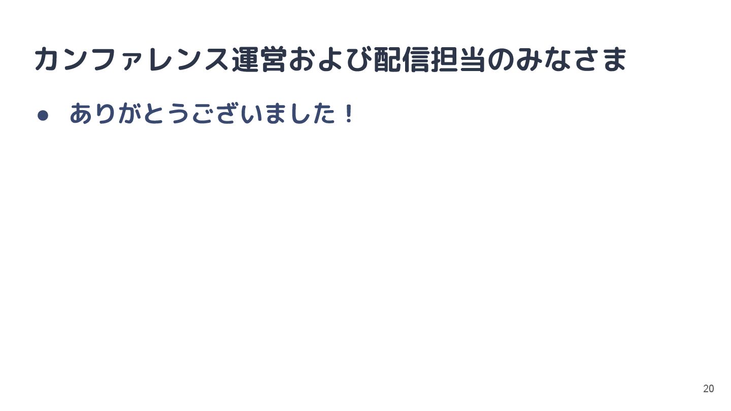カンファレンス運営および配信担当のみなさま • ありがとうございました! 20