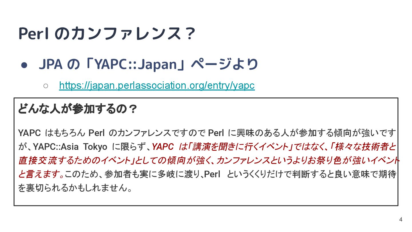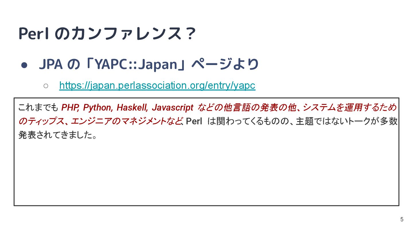 私と YAPC • 会社の Web サイトに Perl は居たが直接の関わりはなし ◦ Perl