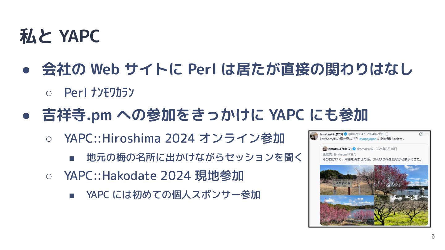 Perl のカンファレンス? • JPA の「YAPC::Japan」ページより ◦ https://japan.perlassociation.org/entry/yapc 5 これまでも PHP,