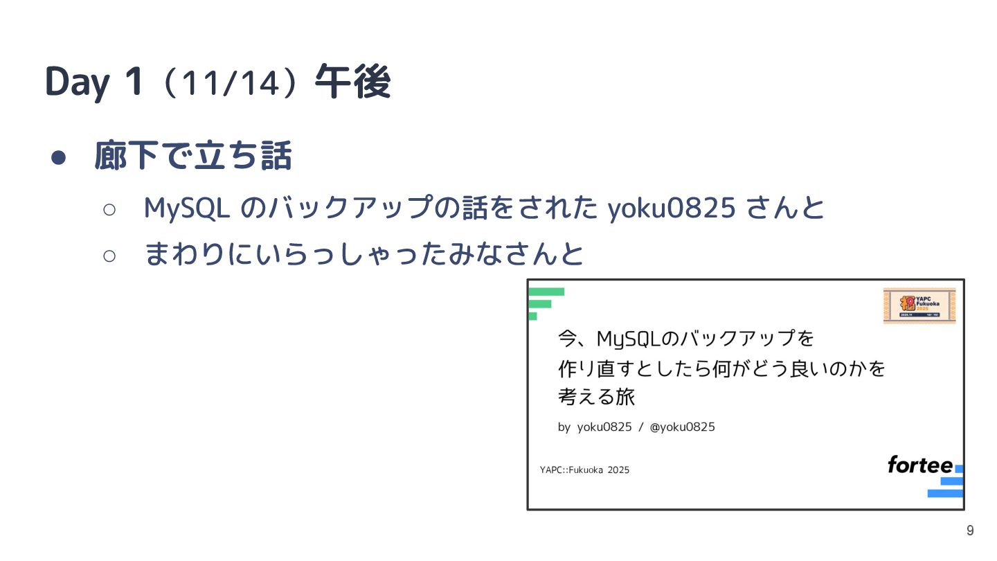 Day 1(11/14)午後 • 廊下で立ち話 ◦ MySQL のバックアップの話をされた yoku0825 さんと ◦