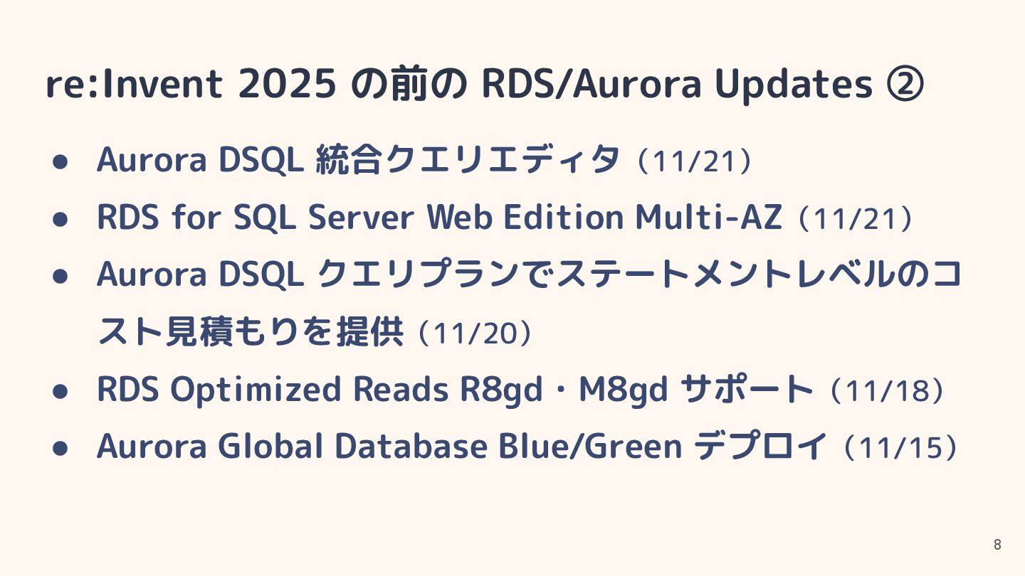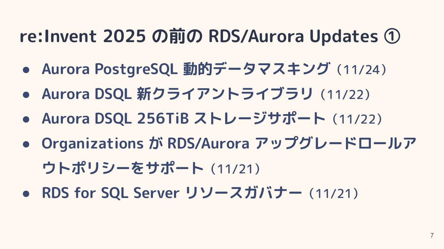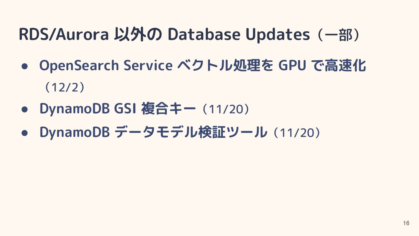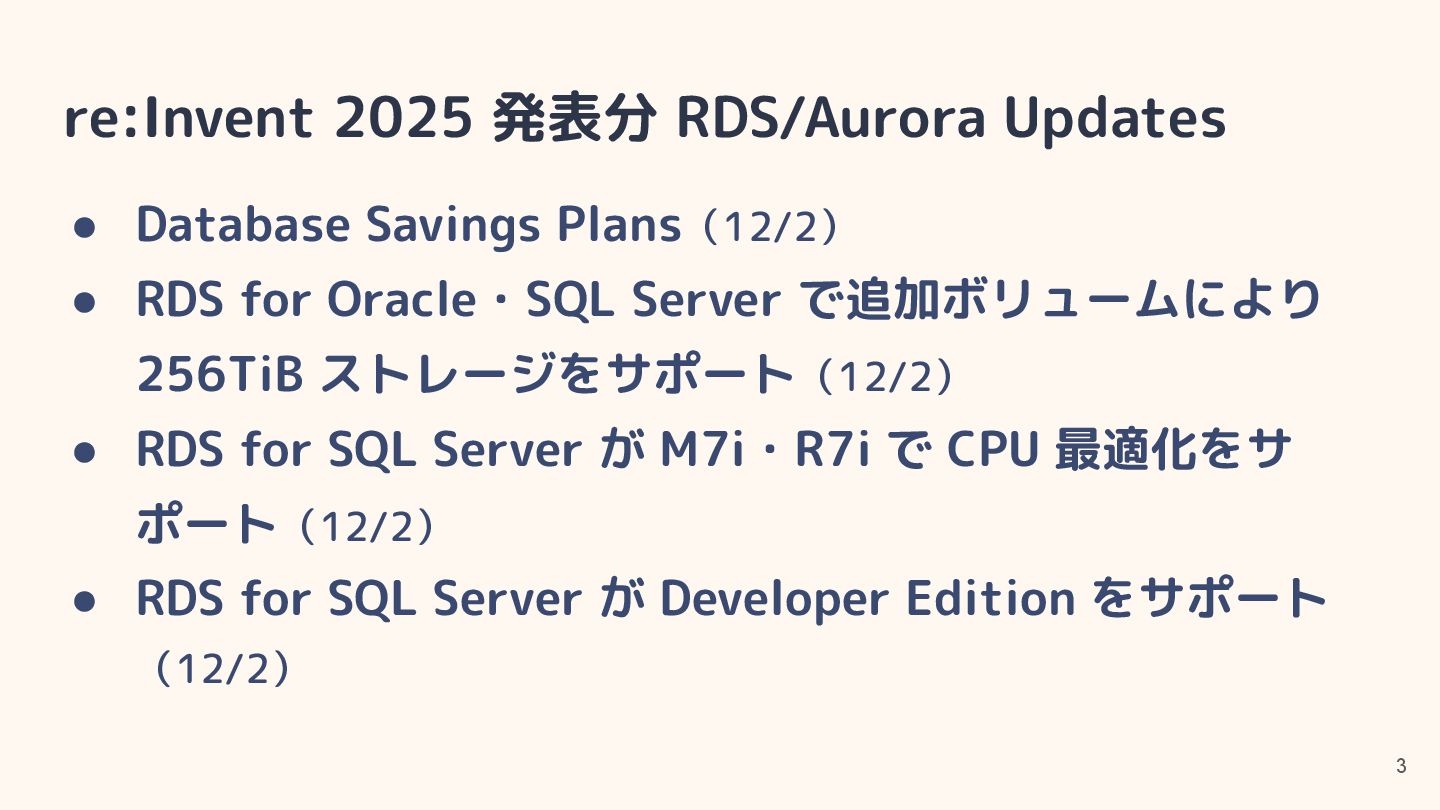 • RDS for Oracle・SQL Server で追加ボリュームにより 256TiB ストレージをサポート(12/2) • RDS for SQL Server が M7i・R7i で CPU 最適化をサ ポート(12/2) • RDS for SQL Server が Developer Edition をサポート (12/2)