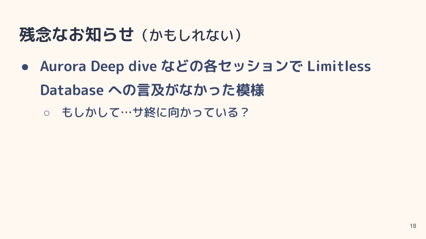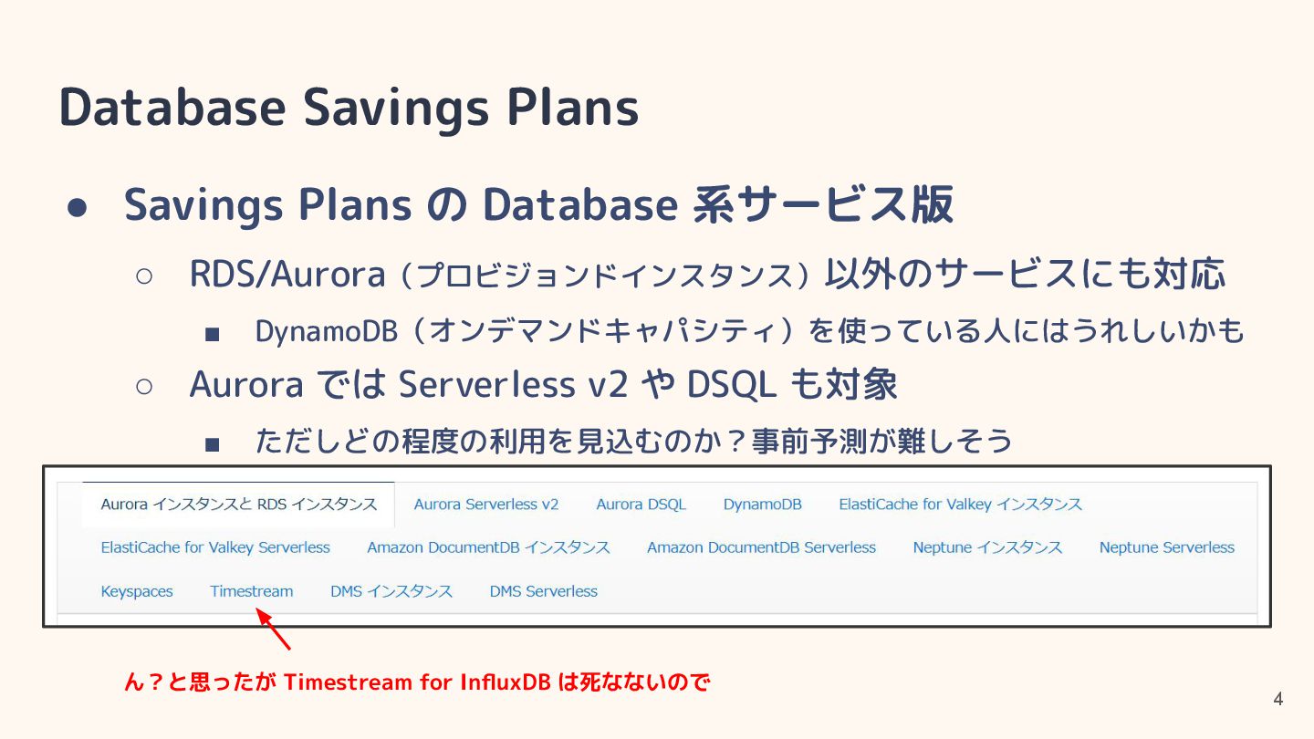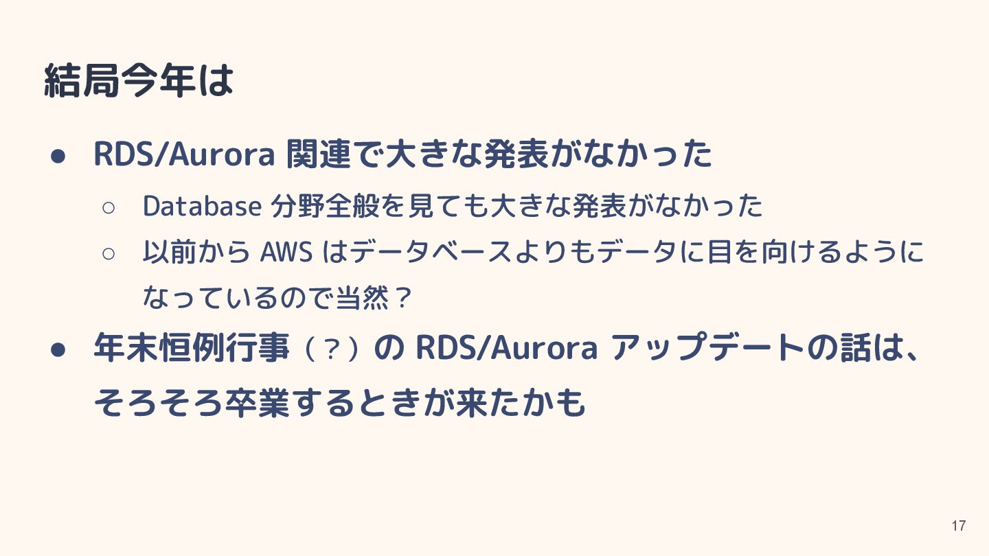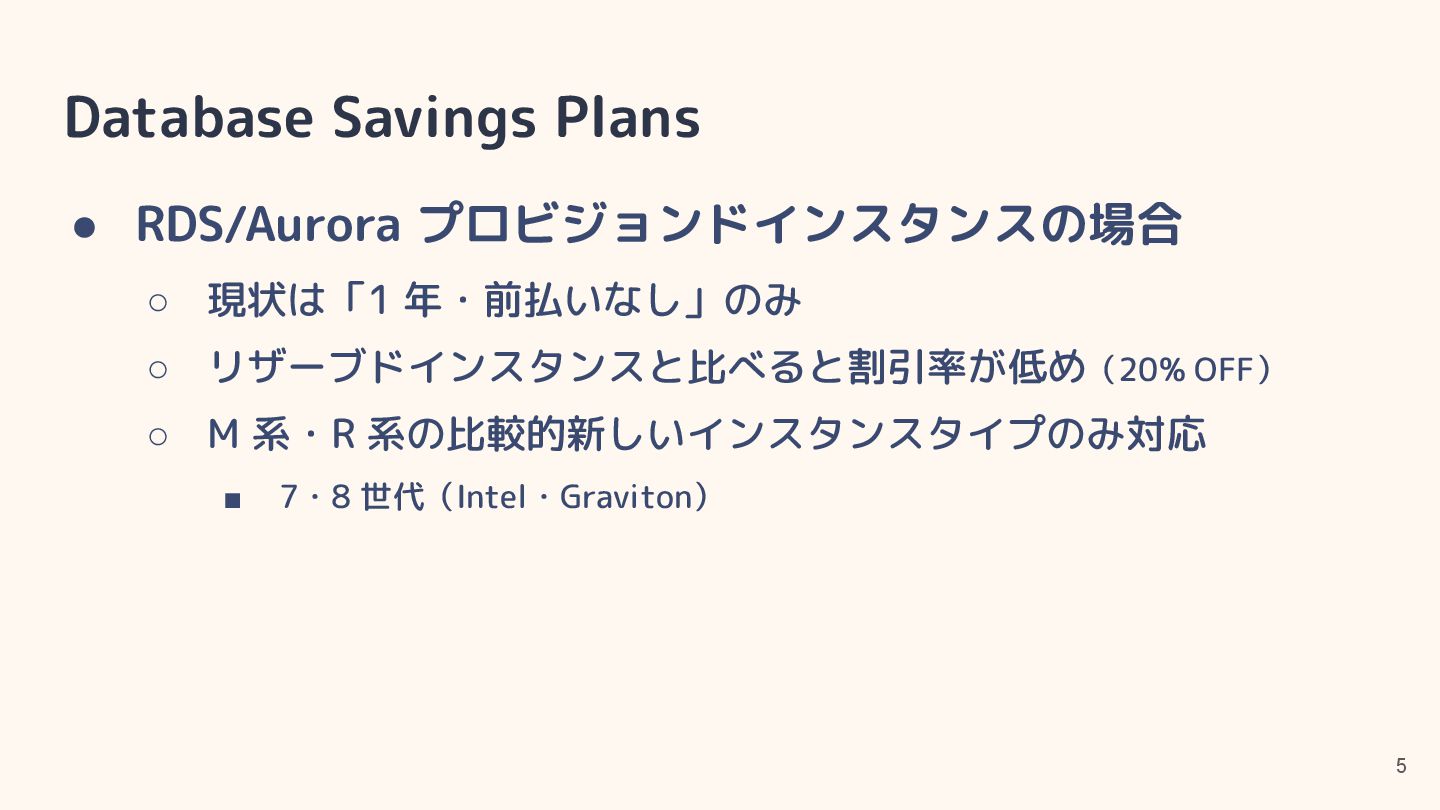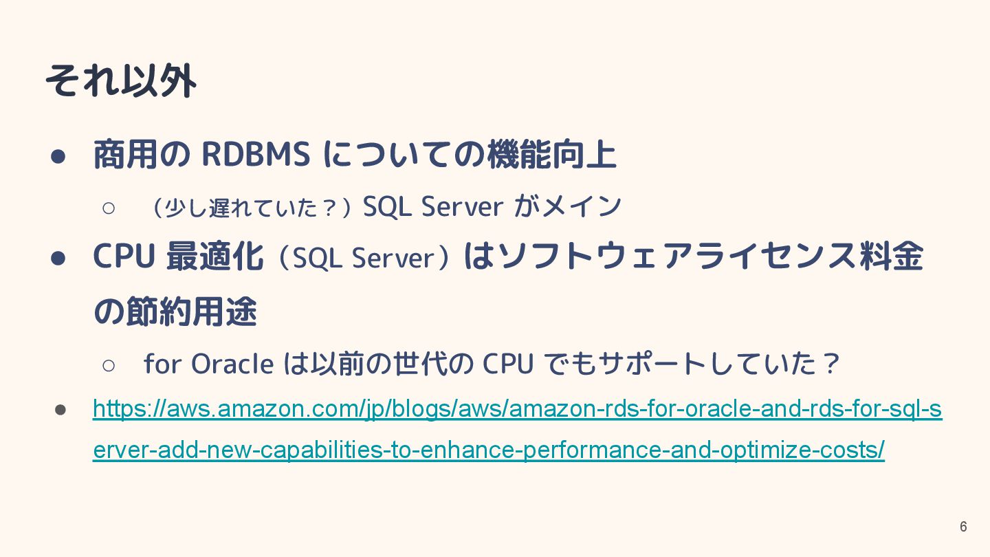 • CPU 最適化(SQL Server)はソフトウェアライセンス料金 の節約用途 ◦ for Oracle は以前の世代の CPU でもサポートしていた? • https://aws.amazon.com/jp/blogs/aws/amazon-rds-for-oracle-and-rds-for-sql-s erver-add-new-capabilities-to-enhance-performance-and-optimize-costs/