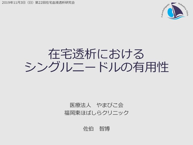 在宅透析における シングルニードルの有⽤性 医療法⼈ やまびこ会 福岡東ほばしらクリニック 佐伯 智博 2019年11⽉3⽇(⽇)第22回在宅⾎液透析研究会