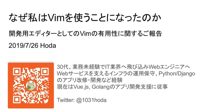 ゴリラ.vim #6で発表した資料です。「なぜ私はVimを使うことになったのか」というテーマで発表しました。強固なプロキシ環境下かつリモート越しの開発において、VS Codeの代わりにVimを試験的に使用した経験から、開発用エディターとしてのvimの有用性について情報を共有します。