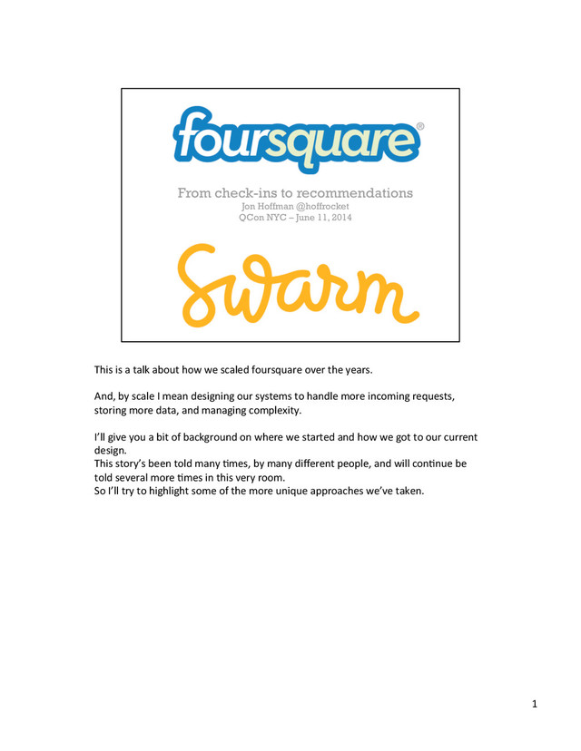 Foursquare has grown from a simple check-in application to one that can tell you the best place to grab a burger. Along the way we've also become the best source of local data for apps like Instagram and Pinterest. I'll talk about the general architecture, storage systems and development practices that we've created to handle the ever increasing volume and complexity. Foursquare started out as a PHP MySQL app running on a single virtual server. Early on we switched to Scala and Mongo and have recently been aggressively splitting a monolithic application into multiple services while maintaining a single code base. I'll talk about the somewhat unique approach we've taken in our service oriented architecture. I'll also go over how we run Mongo and the additional storage systems we're running for more specialized tasks like search, key-value lookups, and offline tasks.