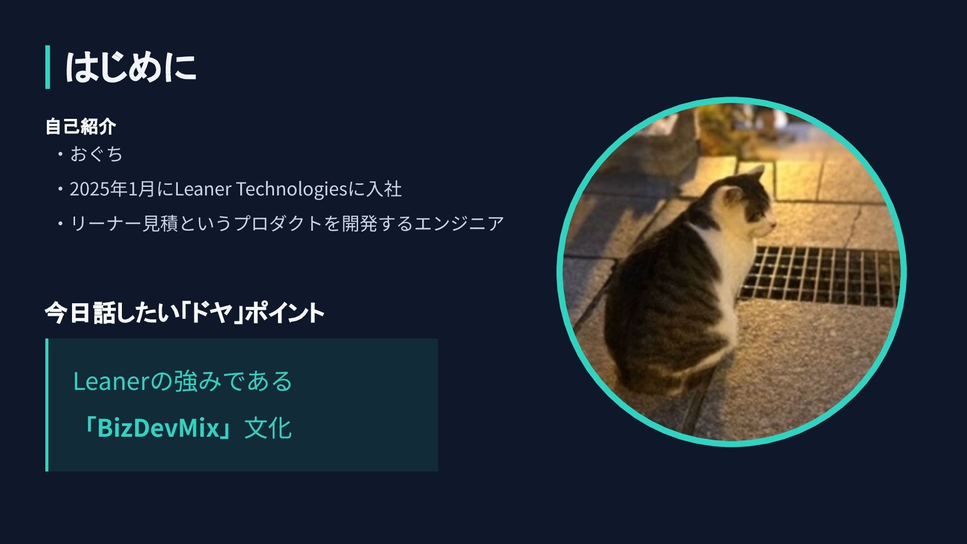 今日話したい「ドヤ」ポイント Leanerの強みである 「BizDevMix」⽂化 はじめに 自己紹介 ‧おぐち ‧2025年1⽉にLeaner Technologiesに⼊社 ‧リーナー⾒積というプロダクトを開発するエンジニア