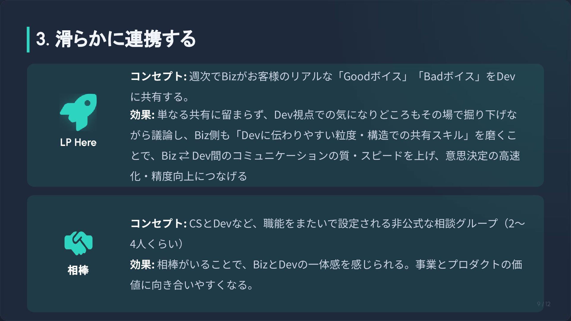 / 12 LP Here コンセプト: 週次でBizがお客様のリアルな「Goodボイス」「Badボイス」をDev に共有する。 効果: 単なる共有に留まらず、Dev視点での気になりどころもその場で掘り下げな がら議論し、Biz側も「Devに伝わりやすい粒度‧構造での共有スキル」を磨くこ とで、Biz ⇄ Dev間のコミュニケーションの質‧スピードを上げ、意思決定の⾼速 化‧精度向上につなげる