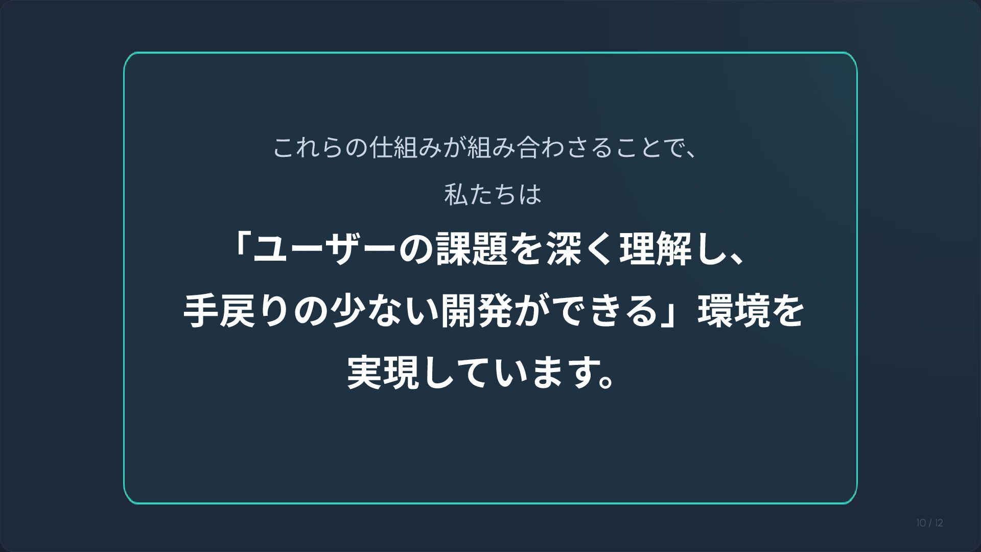 これらの仕組みが組み合わさることで、 私たちは 「ユーザーの課題を深く理解し、 ⼿戻りの少ない開発ができる」環境を 実現しています。 10 / 12