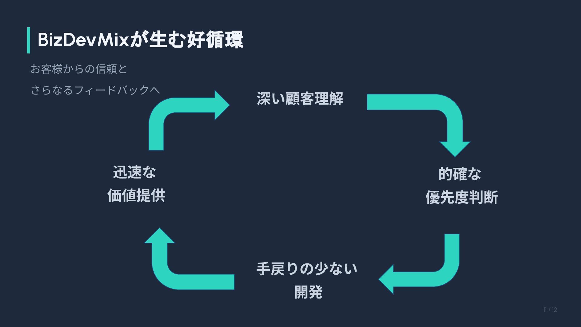 お客様からの信頼と さらなるフィードバックへ 深い顧客理解 ⼿戻りの少ない 開発 迅速な 価値提供 BizDevMixが生む好循環 11 /