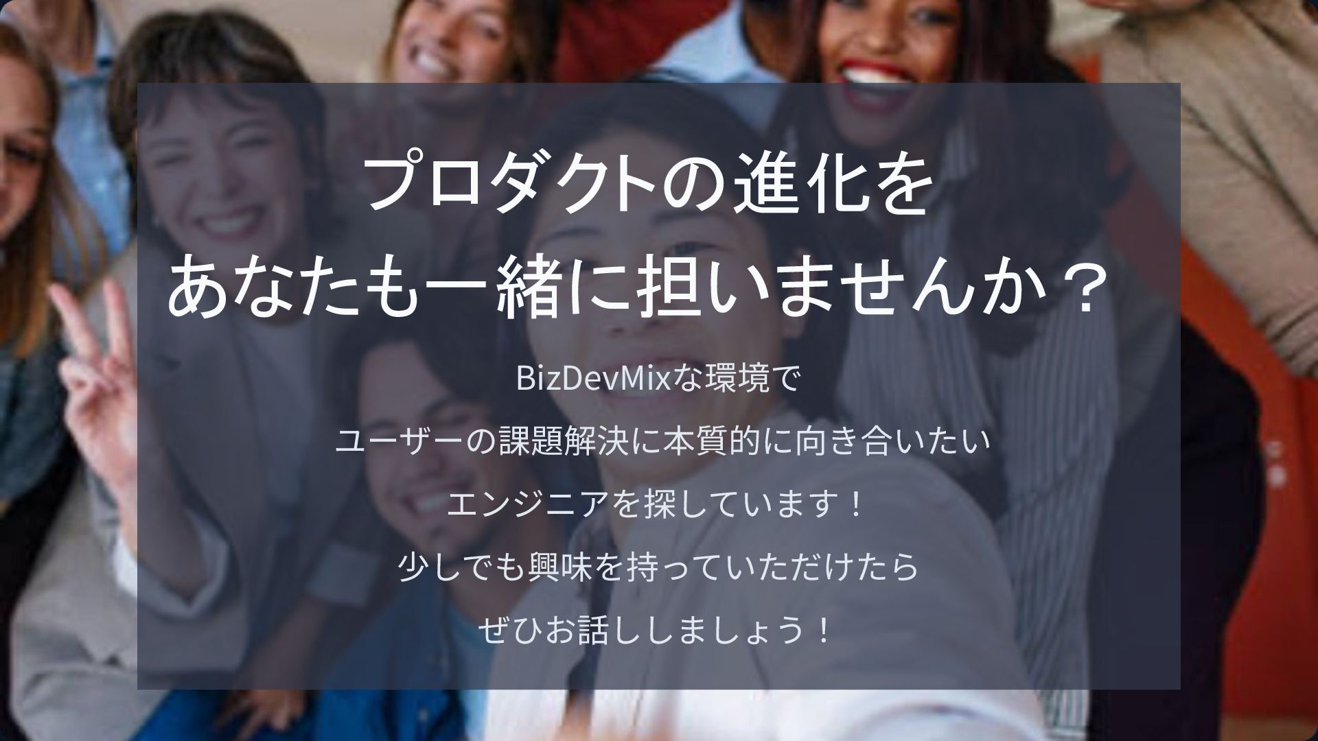 プロダクトの進化を あなたも一緒に担いませんか? BizDevMixな環境で ユーザーの課題解決に本質的に向き合いたい エンジニアを探しています! 少しでも興味を持っていただけたら ぜひお話ししましょう!