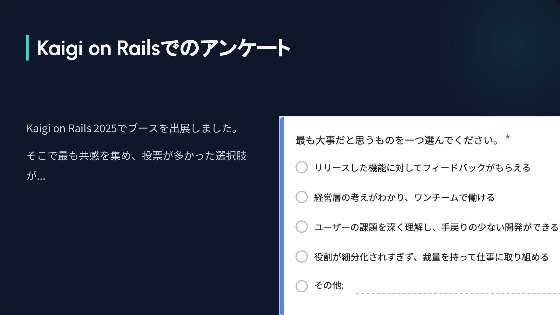 Kaigi on Railsでのアンケート Kaigi on Rails 2025でブースを出展しました。 そこで最も共感を集め、投票が多かった選択肢 が...