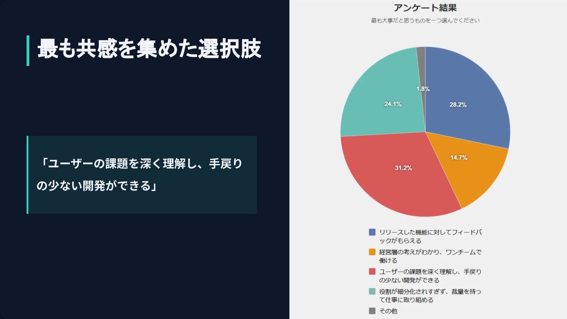 最も共感を集めた選択肢 「ユーザーの課題を深く理解し、⼿戻り の少ない開発ができる」