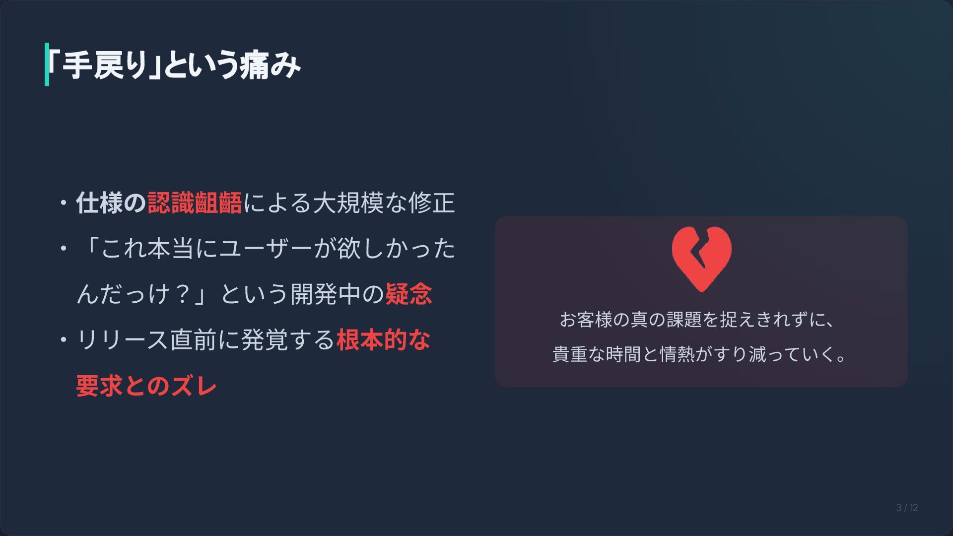 お客様の真の課題を捉えきれずに、 貴重な時間と情熱がすり減っていく。 ‧仕様の認識齟齬による⼤規模な修正 ‧「これ本当にユーザーが欲しかった んだっけ?」という開発中の疑念 ‧リリース直前に発覚する根本的な 要求とのズレ 「手戻り」という痛み 3 /