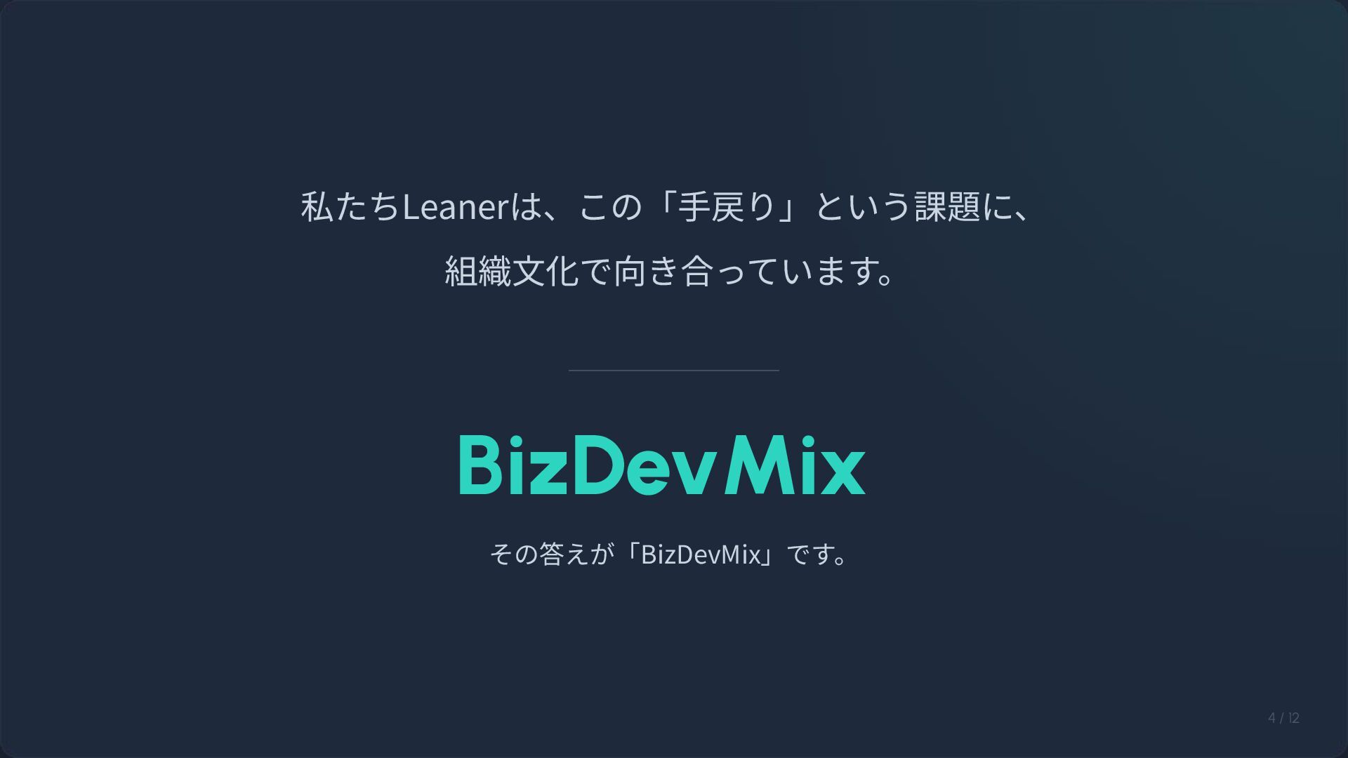 私たちLeanerは、この「⼿戻り」という課題に、 組織⽂化で向き合っています。 BizDevMix その答えが「BizDevMix」です。 4 / 12