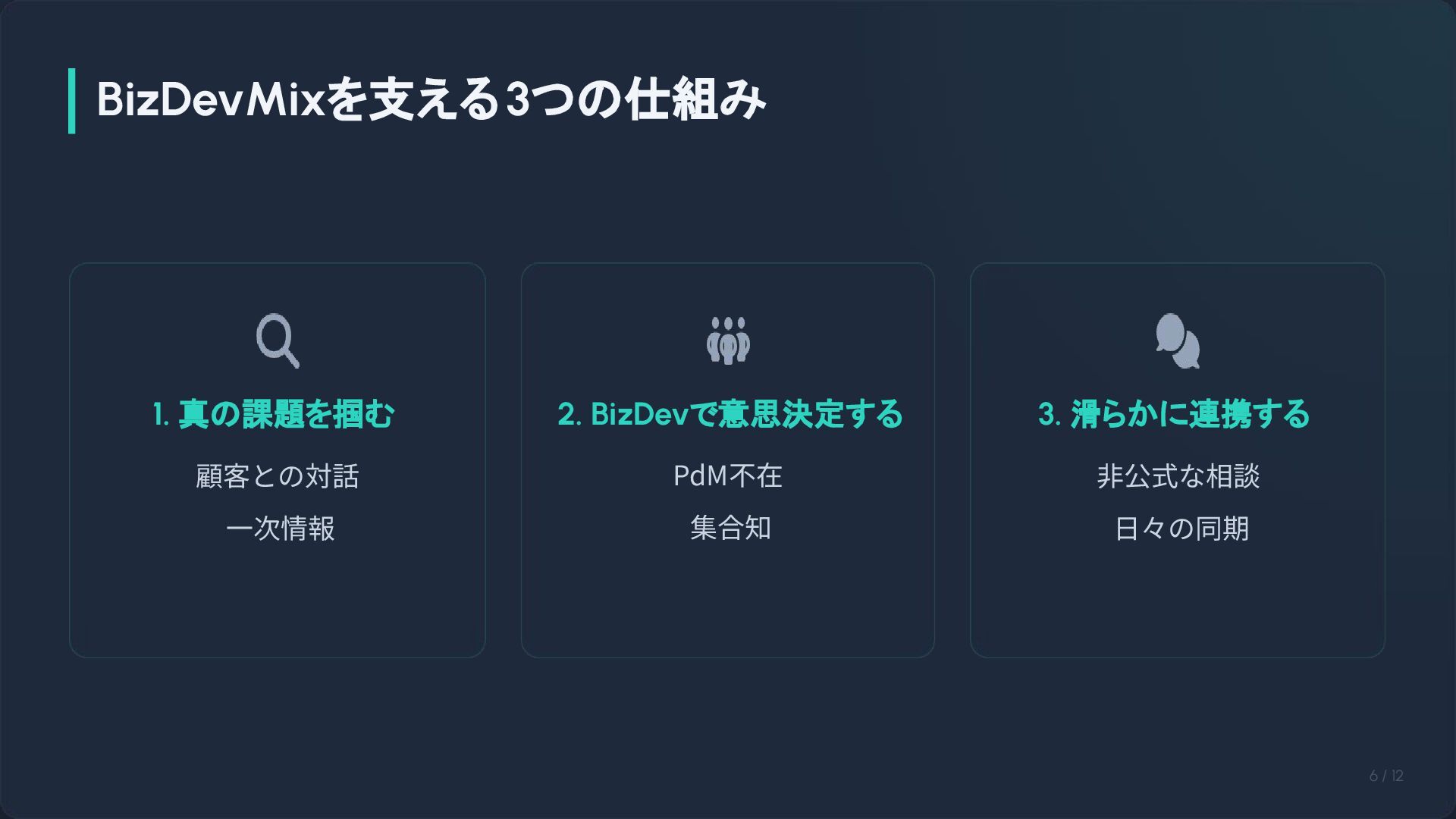 ⾮公式な相談 ⽇々の同期 BizDevMixを支える3つの仕組み 6 / 12