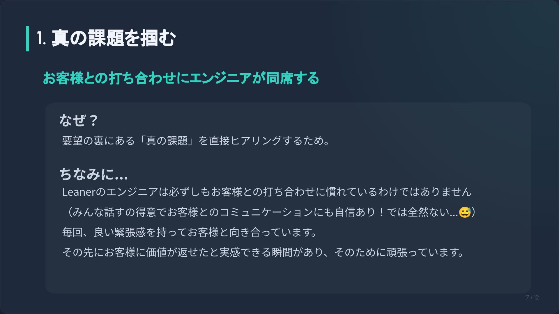 お客様との打ち合わせにエンジニアが同席する 1. 真の課題を掴む 7 / 12 なぜ? 要望の裏にある「真の課題」を直接ヒアリングするため。 ちなみに... Leanerのエンジニアは必ずしもお客様との打ち合わせに慣れているわけではありません