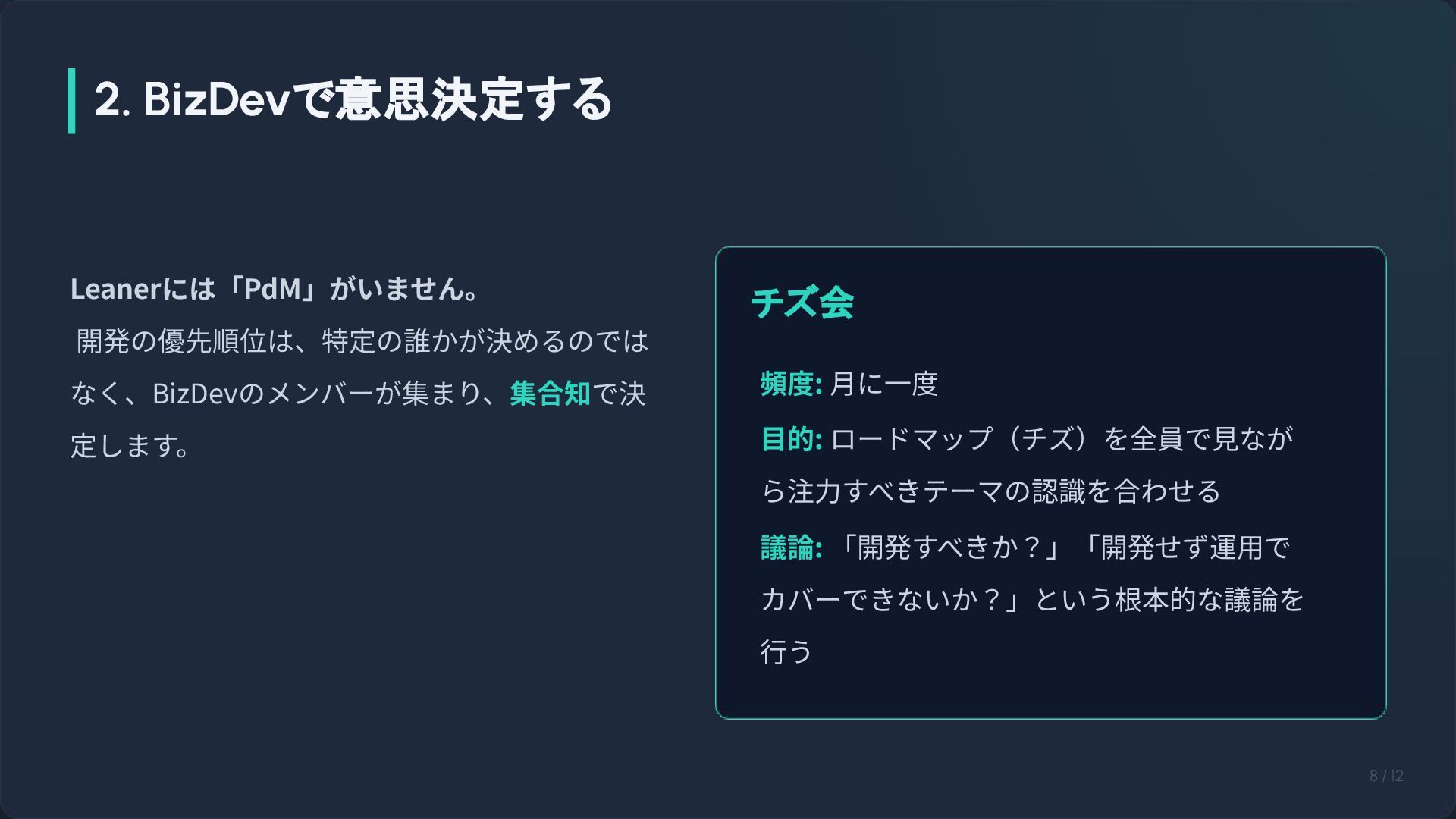Leanerには「PdM」がいません。 開発の優先順位は、特定の誰かが決めるのでは なく、BizDevのメンバーが集まり、集合知で決 定します。 チズ会 頻度: ⽉に⼀度 ⽬的: ロードマップ(チズ)を全員で⾒なが ら注⼒すべきテーマの認識を合わせる