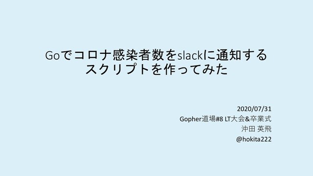 Goでコロナ感染者数をslackに通知する スクリプトを作ってみた 2020/07/31 Gopher道場#8 LT⼤会&卒業式 沖⽥ 英⾶ @hokita222