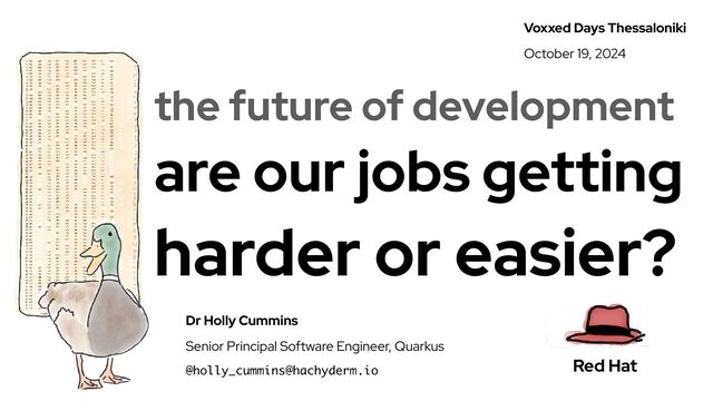 In the early days of computing, software developers had to encode their programs on punch cards, and carry the bits around by hand. By the 1970s they had the joy of keyboards and displays. Sadly, those oppressed developers had to wear flare trousers, work in C, and manage their own memory. By 2000 the memory thing was sorted out, but the trousers were arguably worse, and developers had to maintain their own hardware. Now, our hardware is someone else’s problem, everything is open source, AI can write our code, and we have a choice whether to work in Java, Kotlin, Javascript, Ruby, Go, Python, Rust, or Typescript. On the other hand, now we have yaml. And many of us find we have to work in ALL of Java, Kotlin, Javascript, Ruby, Go, Python, Rust, or Typescript, all while managing a cloud, becoming security experts, learning CSS, and debugging the code our AI “helper” wrote. And we’re supposed to be full-stack, and shifting left, and building up open source in our free time. Are we living the dream or sinking under cognitive overload?