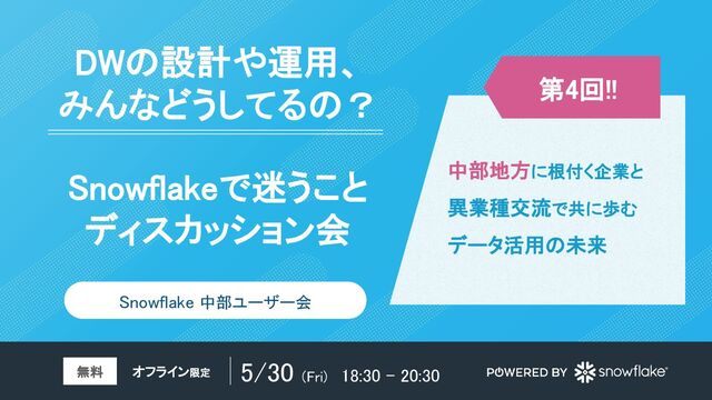 この資料は 2025年5月30日(金)に開催したイベント「第4回 Snowflake 中部ユーザ会 〜DWの設計や運用、みんなどうしてるの? Snowflakeで迷うことディスカッション会~」(https://techplay.jp/event/980596)のディスカッション用資料です。