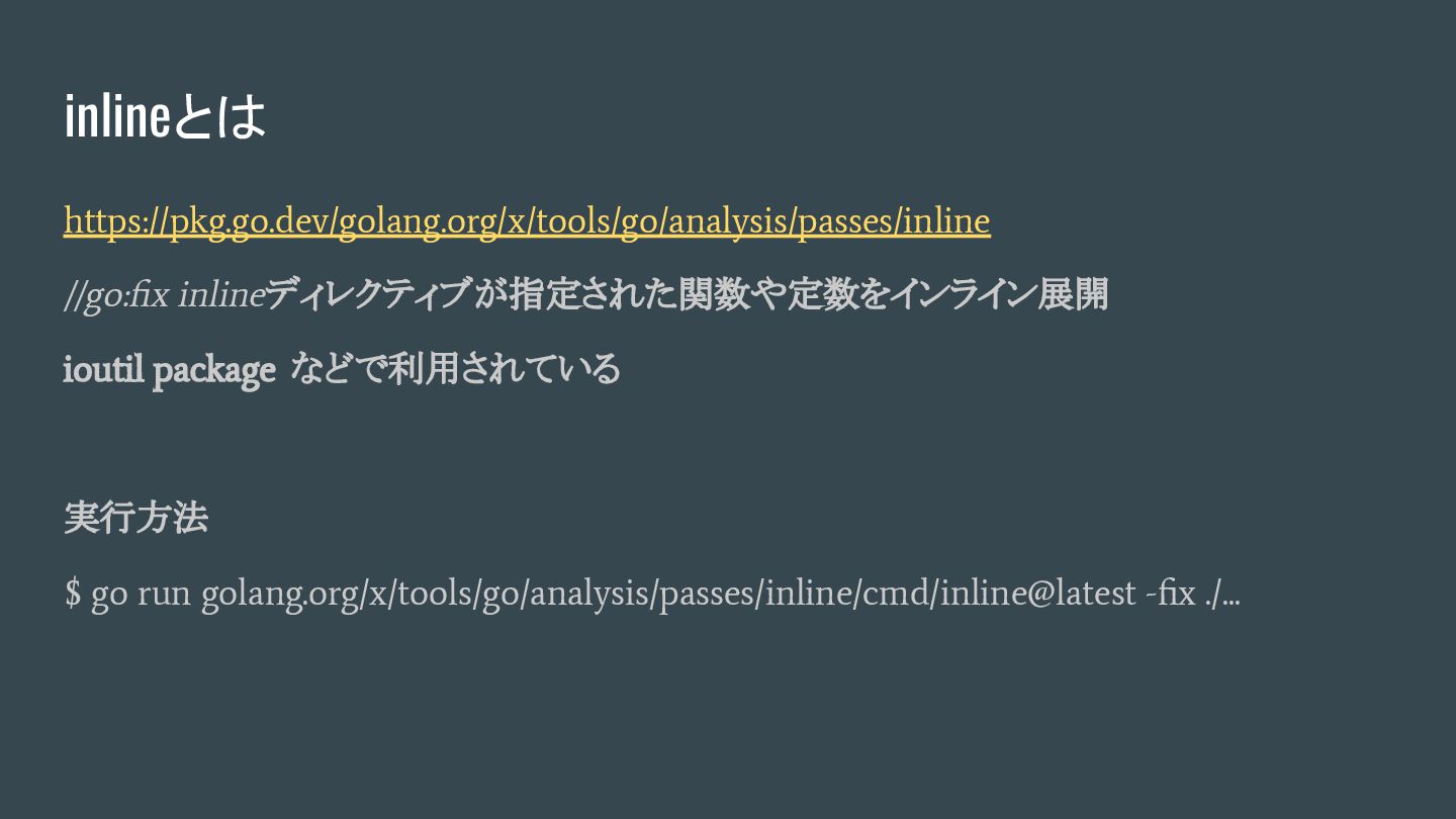 inlineとは https://pkg.go.dev/golang.org/x/tools/go/analysis/passes/inline //go:fix inlineディレクティブが指定された関数や定数をインライン展開 ioutil package などで利用されている 実行方法 $ go