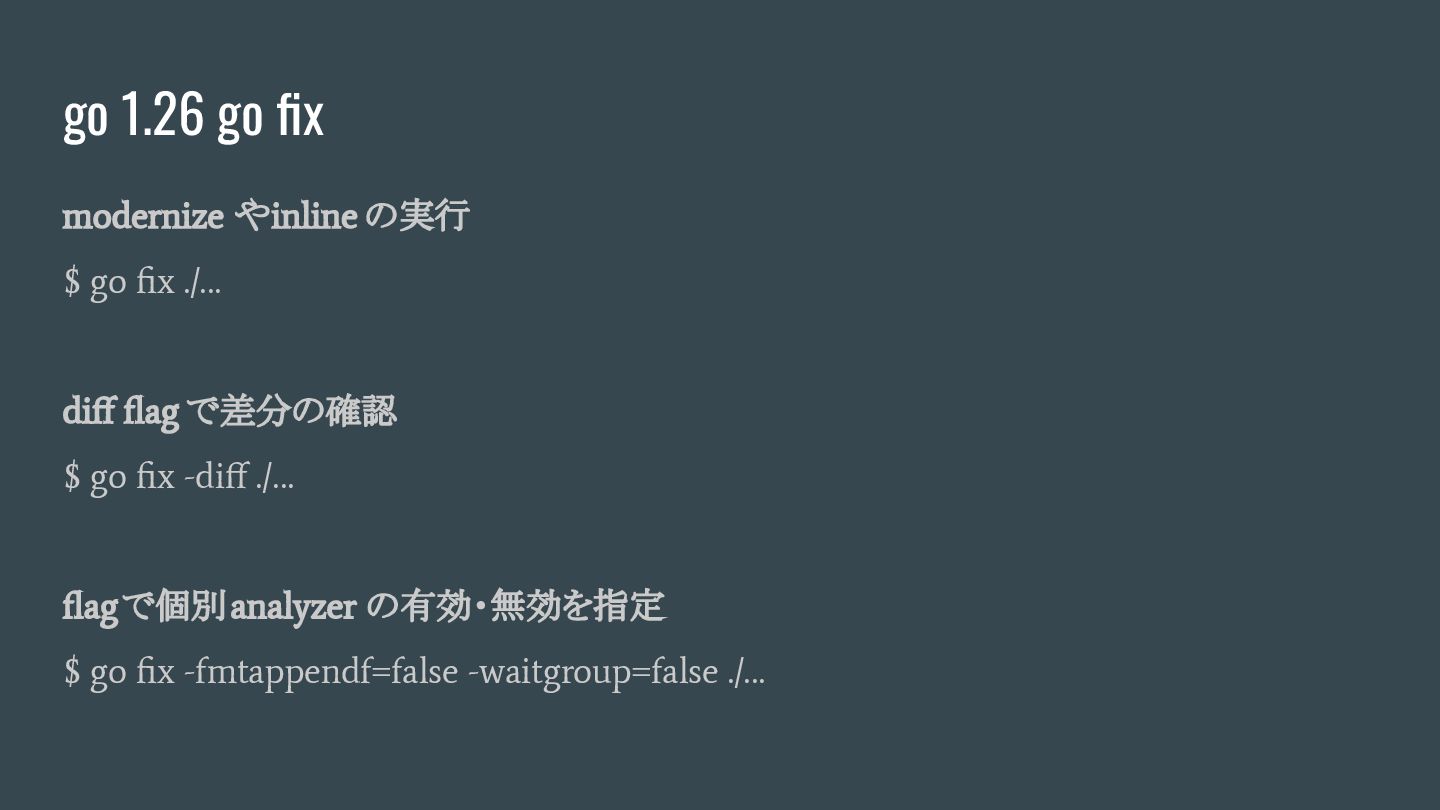 ./… diff flag で差分の確認 $ go fix -diff ./… flagで個別analyzer の有効・無効を指定 $ go fix -fmtappendf=false -waitgroup=false ./…