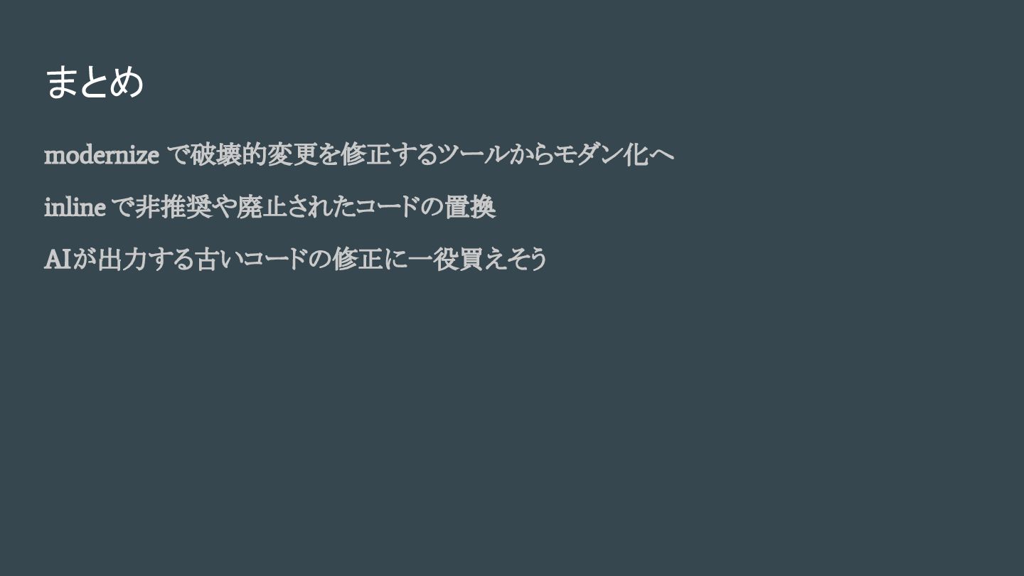 modernize で破壊的変更を修正するツールからモダン化へ inline で非推奨や廃止されたコードの置換 AIが出力する古いコードの修正に一役買えそう まとめ