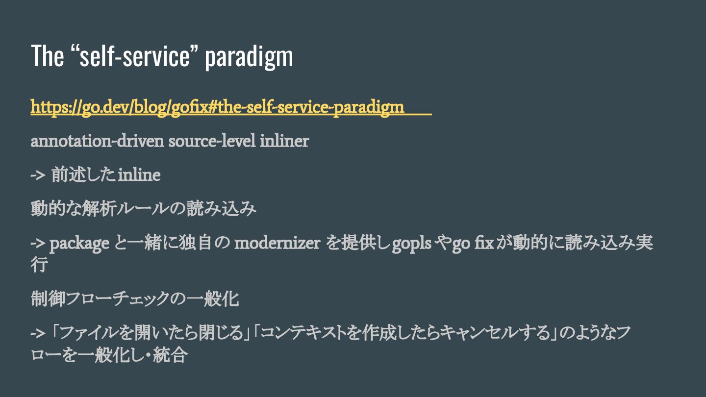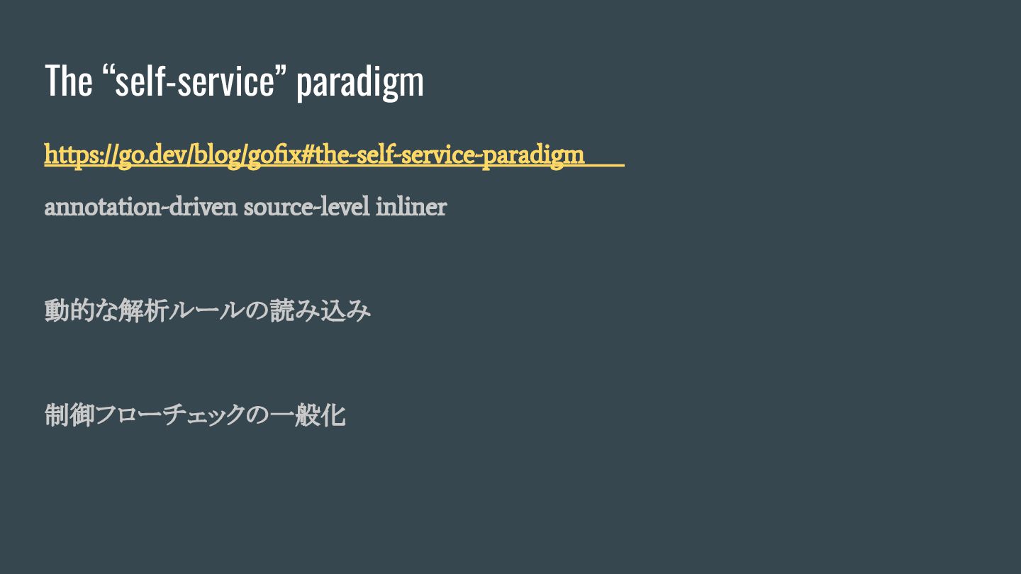 The “self-service” paradigm https://go.dev/blog/gofix#the-self-service-paradigm annotation-driven source-level inliner 動的な解析ルールの読み込み 制御フローチェックの一般化